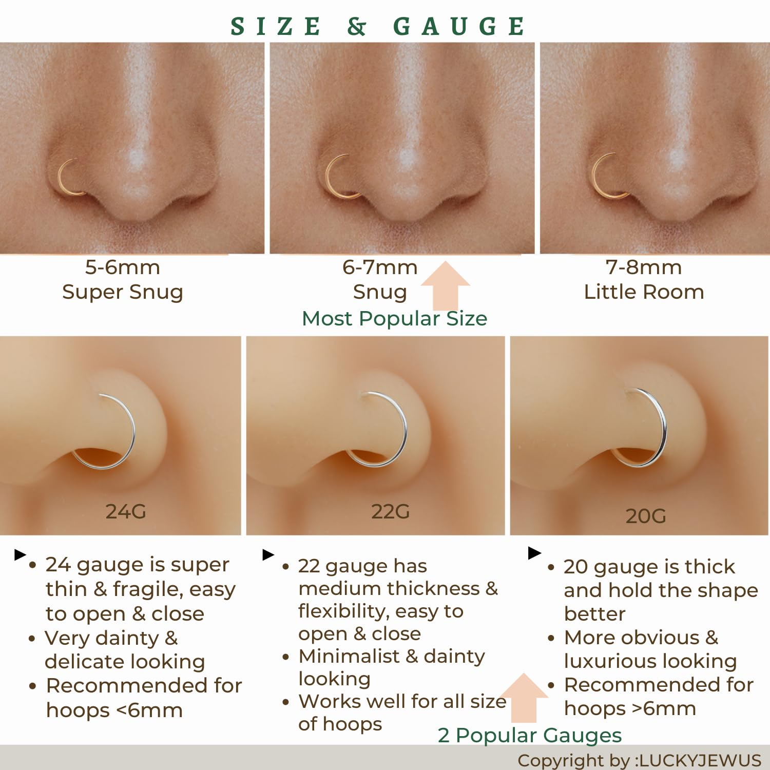 • [Perfect Fit for Every Nose]: This gold nose hoop is small and thin, very dainty and cute. Available Sizes: 5mm-6mm, 6mm-7mm, 7mm-8mm, with options of thickness: 20G / 22G / 24G. Please follow the listing instruction to measure and choose your perfect fit.