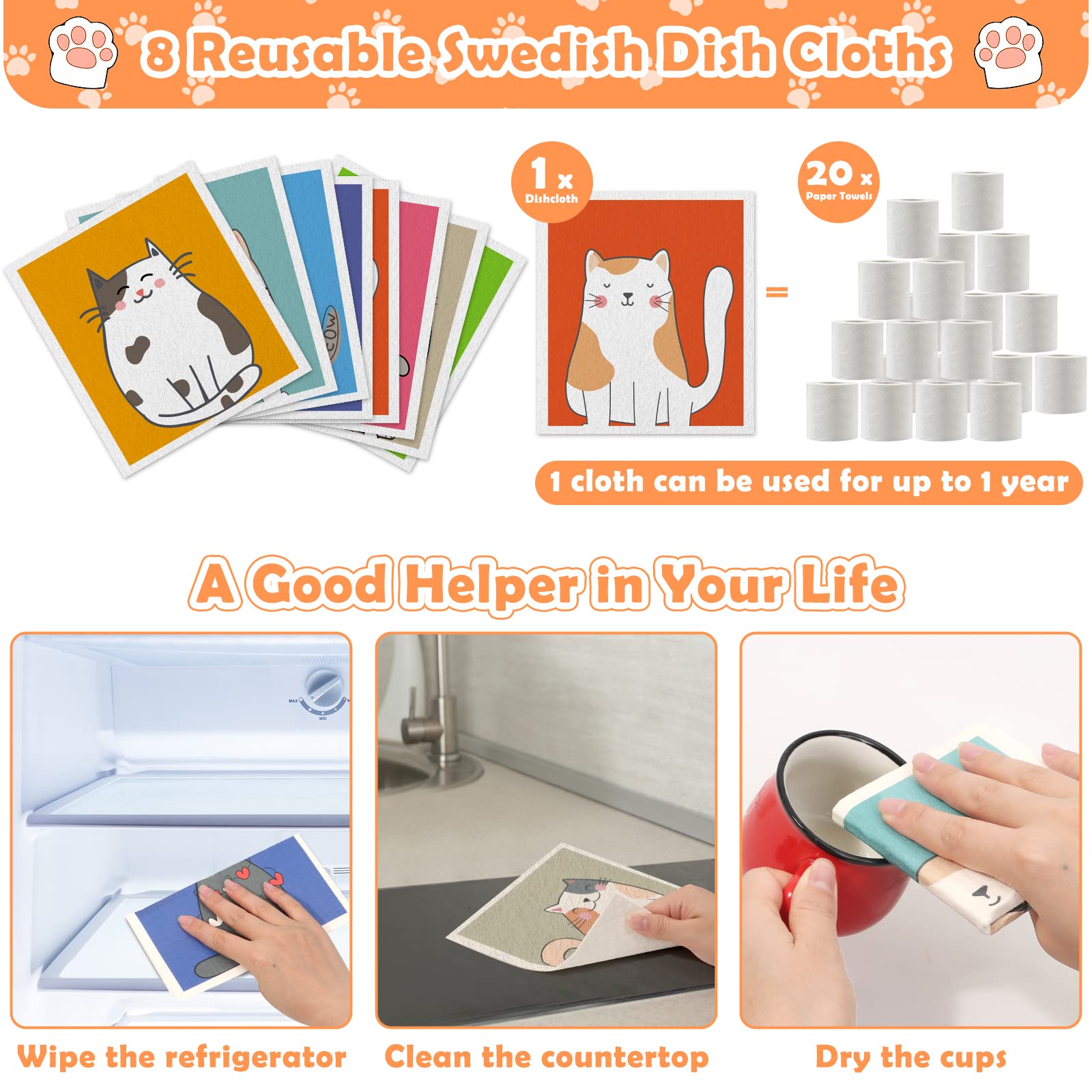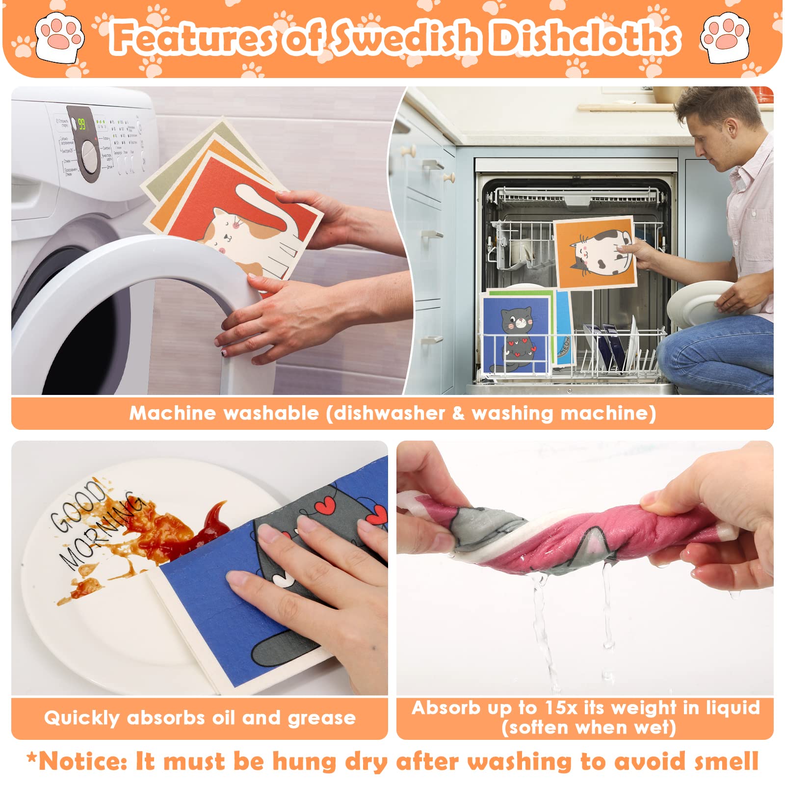 • ๐’๐ฐ๐ž๐๐ข๐ฌ๐ก ๐ƒ๐ข๐ฌ๐ก ๐‚๐ฅ๐จ๐ญ๐ก๐ฌ ๐’๐ž๐ญ Swedish Kitchen dish cloths include 8 different patterns, which are printed with various cute cats for distinguish various use and matching home dรฉcor. Each of kitchen towels is 20 x 18 cm/ 8 x 7 inches, maximize drawer space and use this to wipe our counters stove, clean up house spills and easy to throw in washing machine for quick disinfecting.