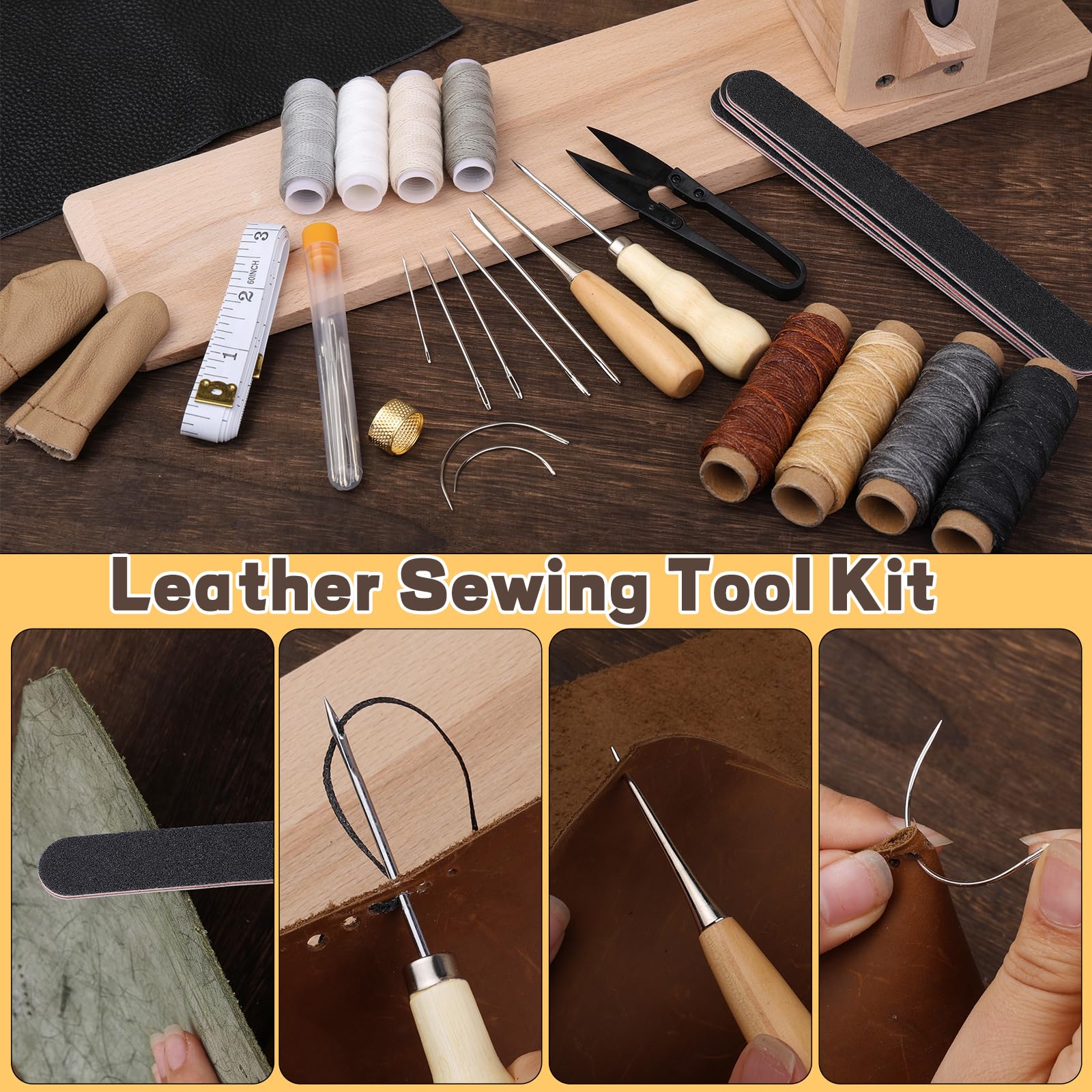 • Leather Pony Hand Sewing Kit: 1* Pony Leather, 7* Big Eye Leather Sewing Needles, 9* Big Eye Blunt Needles, 4* Waxed Thread, 4* Sewing Thread, 2* Leather Awl, 3* Nail File, 2* Finger Cot, 1*Scissors, 1*Thimble, 1*Ruler, 1*A5 Leather.