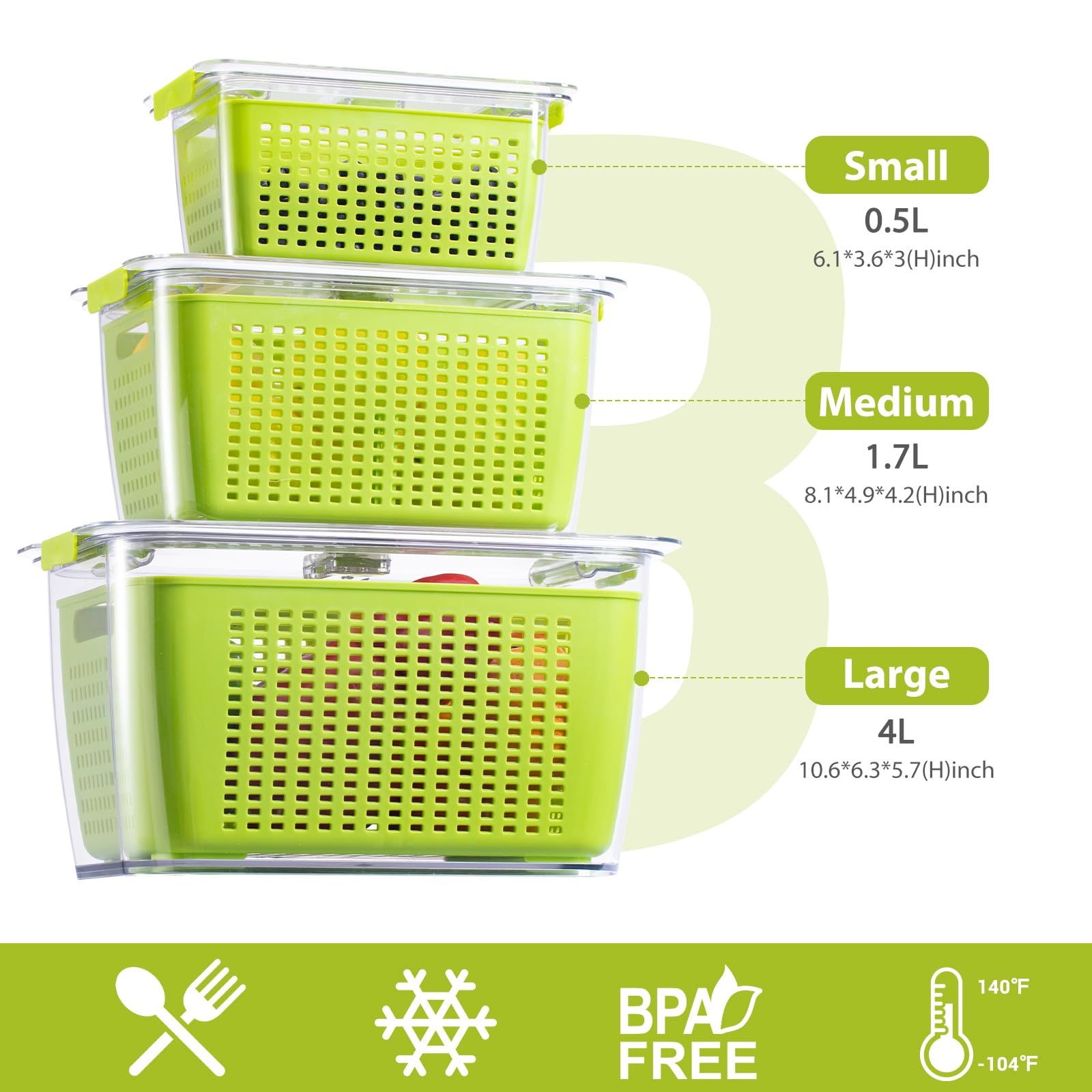 • 【Best Gift】This containers for fresh is great gift ideal for your friend, family. The containers are portable and easy to carry making them ideal for outdoor activities such as picnics, camping or road trips. Three different size food storage containers can be used to store many types of fruits or vegetables, such as lettuce, cabbage, strawberry, blueberry and different types of meat and fish. It can also be easily used as salad or vegetables mixing bowls.