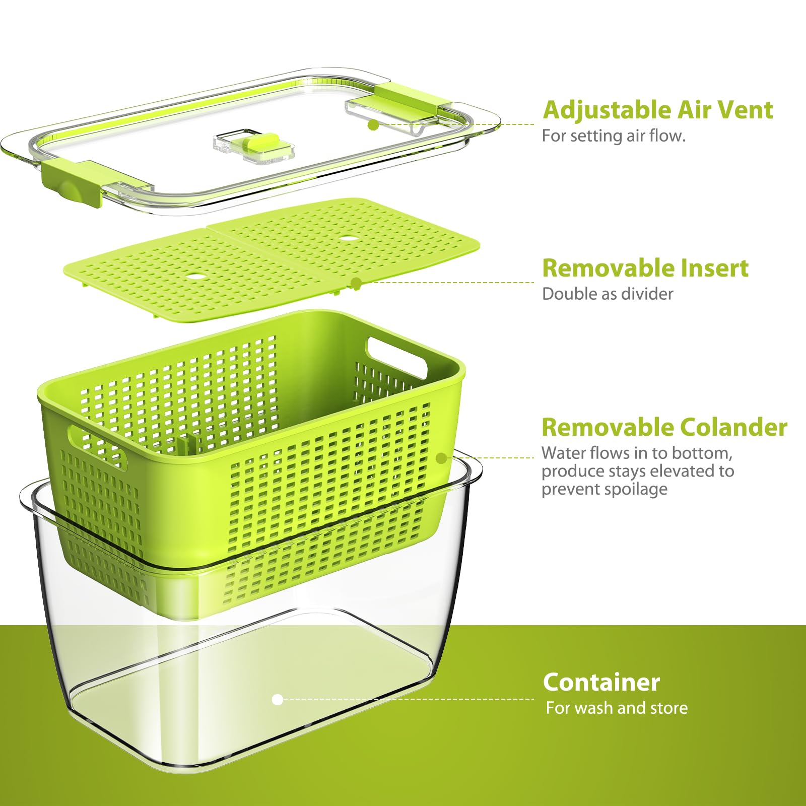 • 【Fresh Fridge Containers】LUXEAR fruit container sets come with 18 cup, 6.8 cup and 1.92 cup three of containers. Each of storage containers designed with adjustable vents which can regulate the flow of air in and out, control the humidity inside, help prevent spoilage, keep fruits and vegetables fresh for up to two weeks for maximum freshness.
