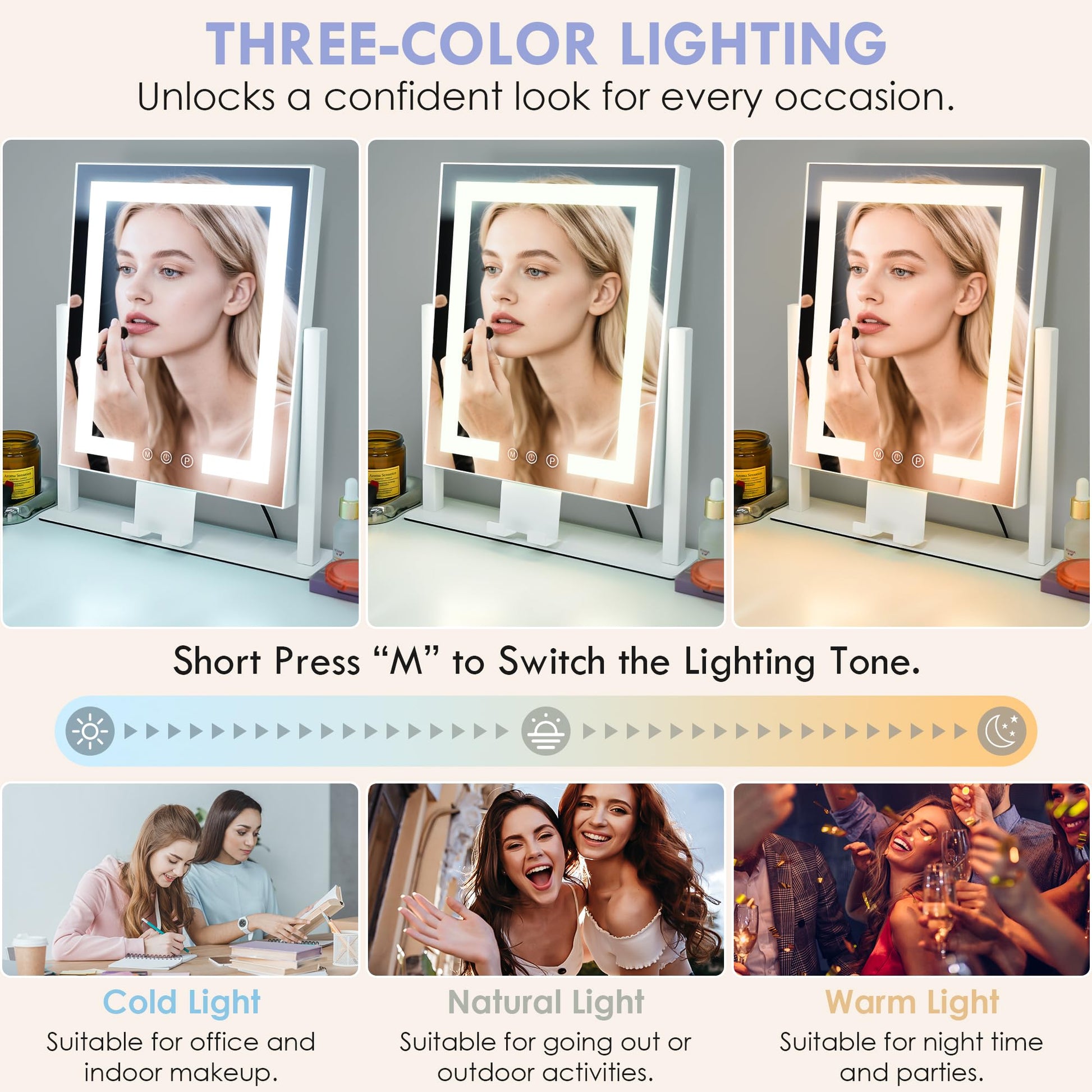 • Three different Colors Lighting :Makeup Mirror with Lighting has 3 color djustable brightness and 3 lights color modes(day light(5500K), cold light(7800K), warm light(4000K)), helping you to finish a flawless professional makeup suitable for any occasions