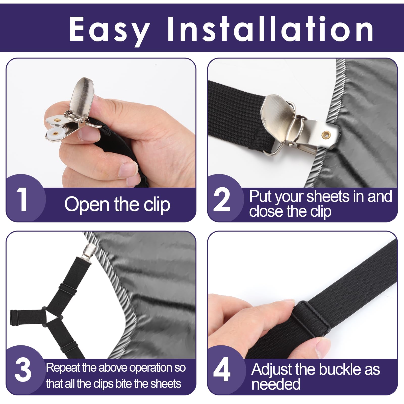 • Easy to Install: Only Three Steps! Open the Clips, Put the Sheet into Clips, Press the Clips with the Sheet,these Sheet Holders Are Compatible with All Bed Sizes, From Full to King