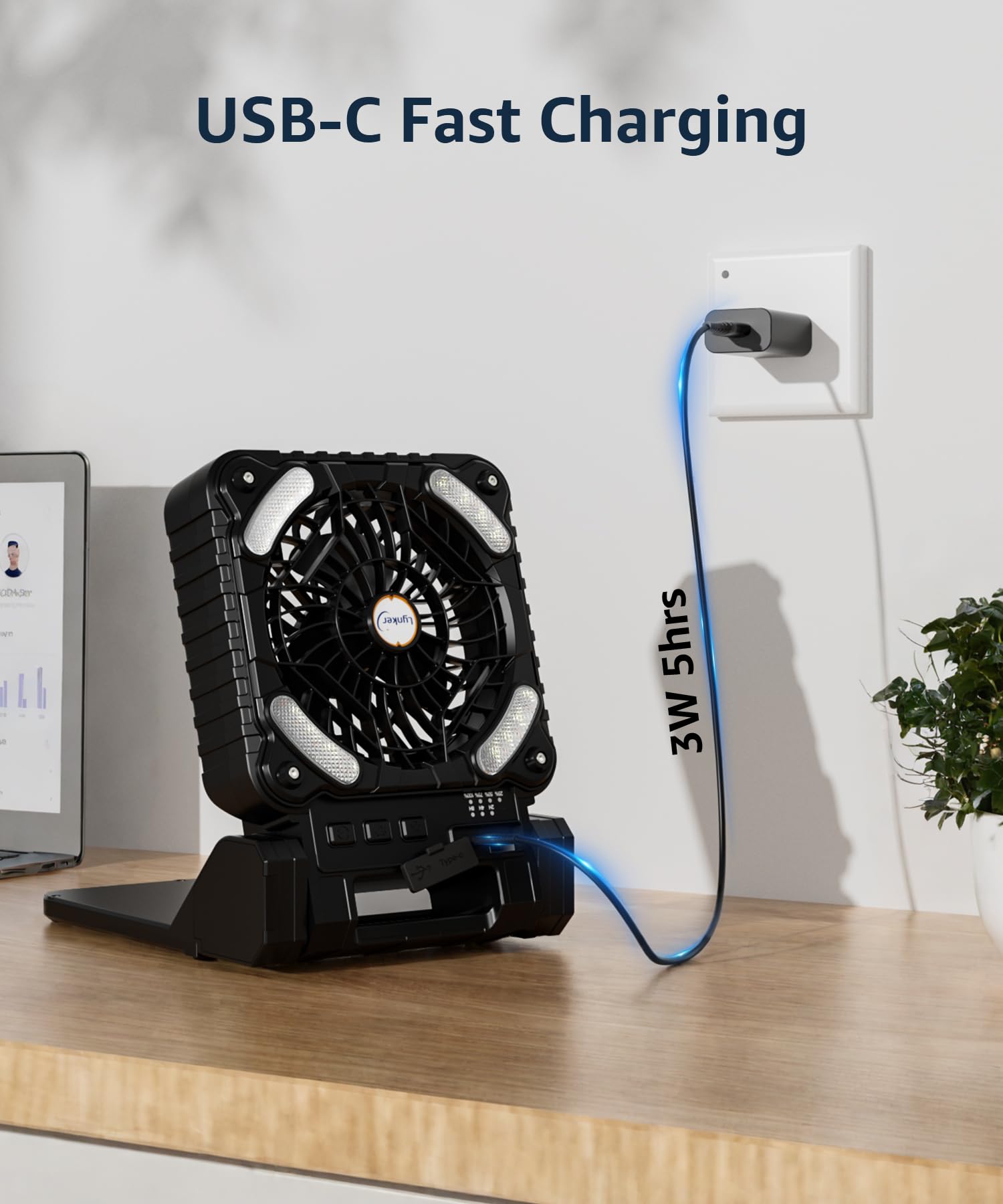 • Versatile All-Day Companion – Can be used while charging, ensuring continuous use in all your activities. Perfect for camping, hiking, power outages, garages or daily use. Combining cooling, lighting and portability, it is suitable for adventure, emergency or home comfort.