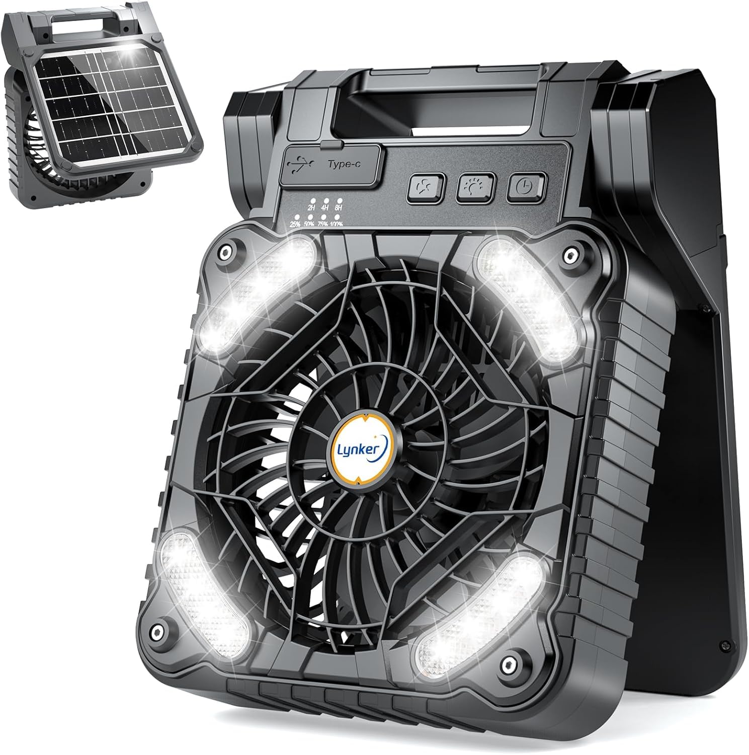 lynker Camping Fan Solar Powered with LED Lantern & Power Bank, Portable Rechargeable Battery Operated, 4 Speeds, 35dB Ultra-Quiet, 8H Timer, Foldable Fan for Tent, RV, Emergency, Hiking (Black)