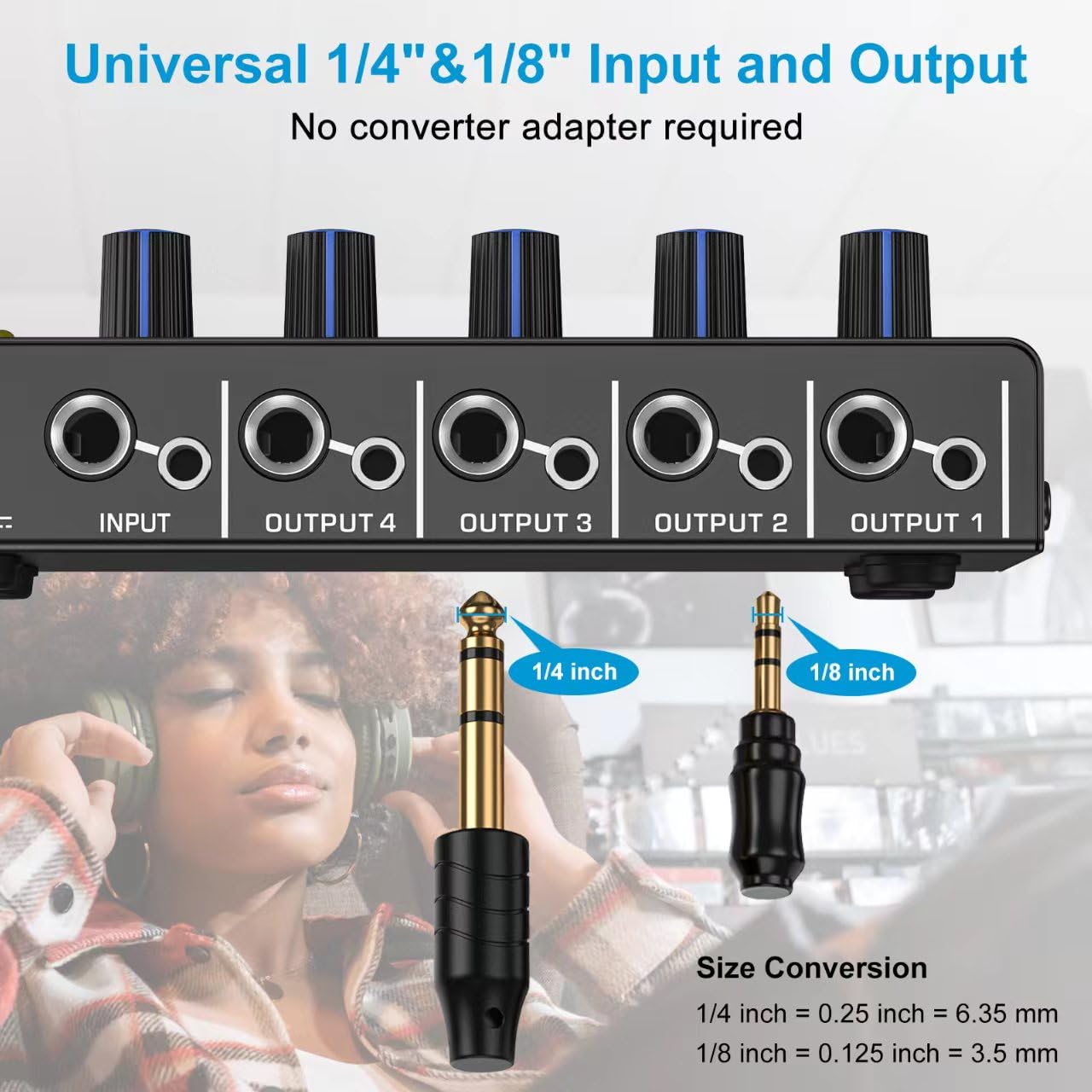 • HEADPHONE AMP: Get superior audio with our 4-channel stereo headphone amplifiers, featuring ultra-low noise output amplifiers that provide high power stereo with output level control for each channel. This headphones for an amp No converter adapters are required as they work with both 1/8 inch(3.5MM) or 1/4 inch(6.35MM) headphones. Perfect for 50mm driver 32~100Ω headphones, the amplifier can power up to four pairs of headphones with four independent volumes