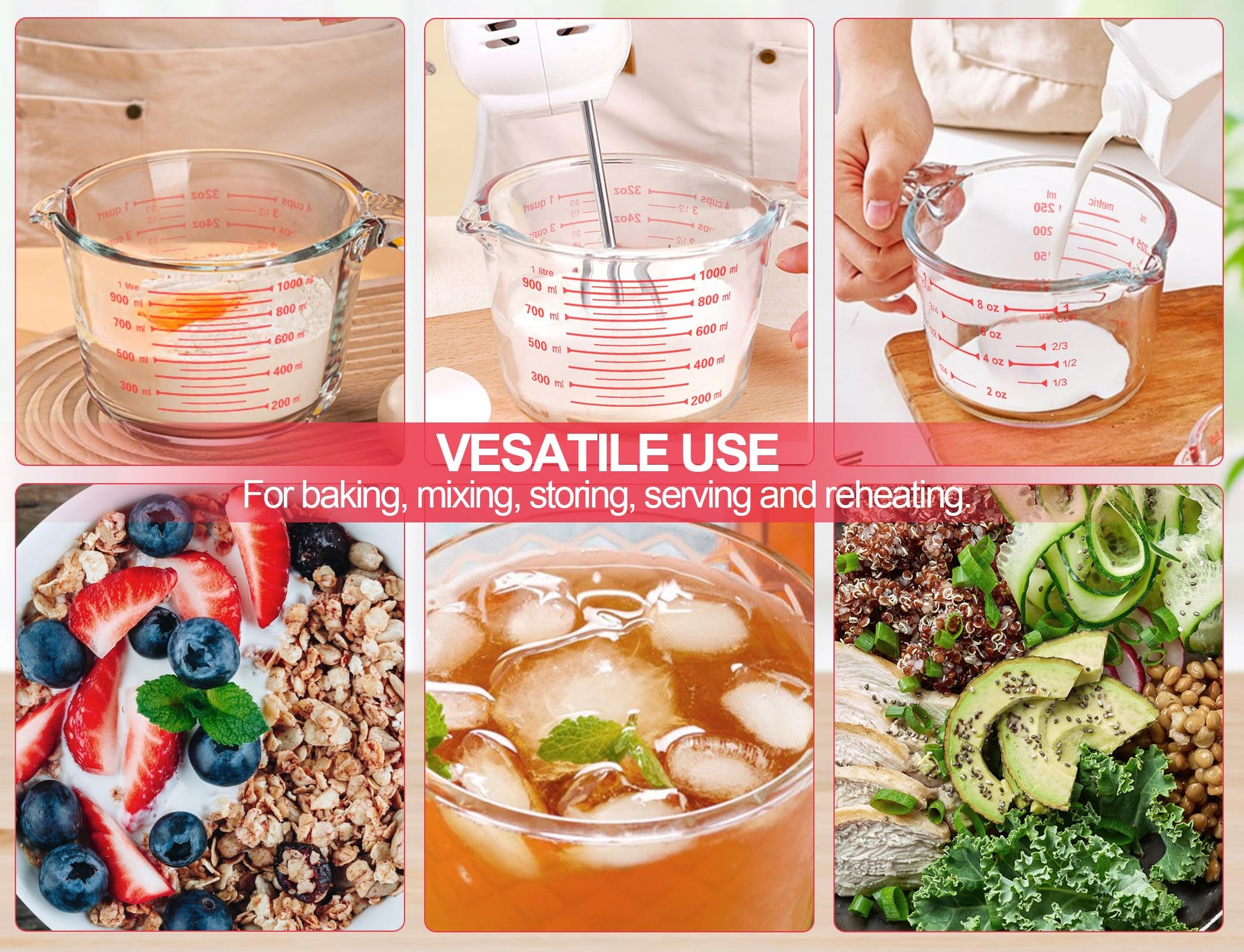 • PREMIUM GLASS: Our measuring cups are made of borosilicate glass, can be used in microwave, oven, freezer and top rack of dishwasher. Great for everyday mixing and serving
