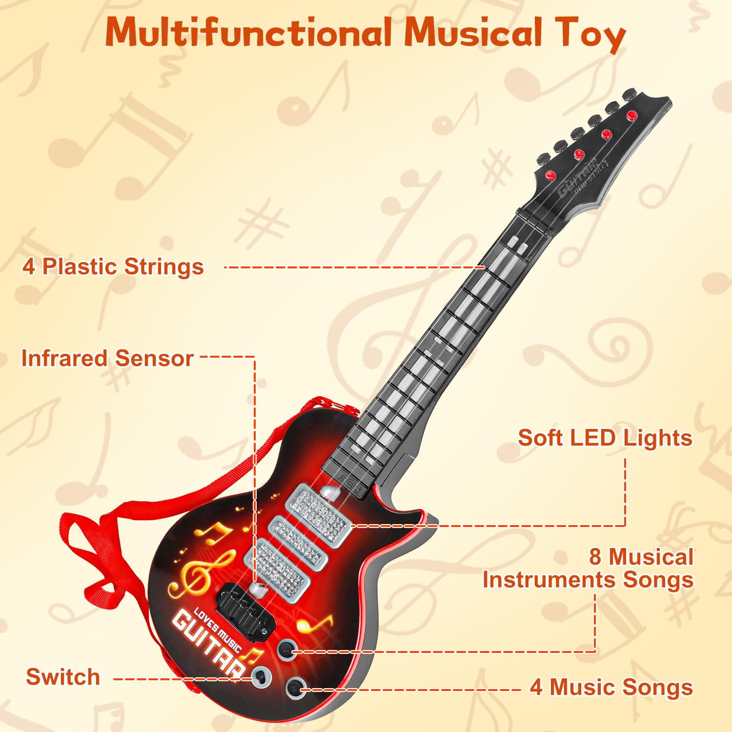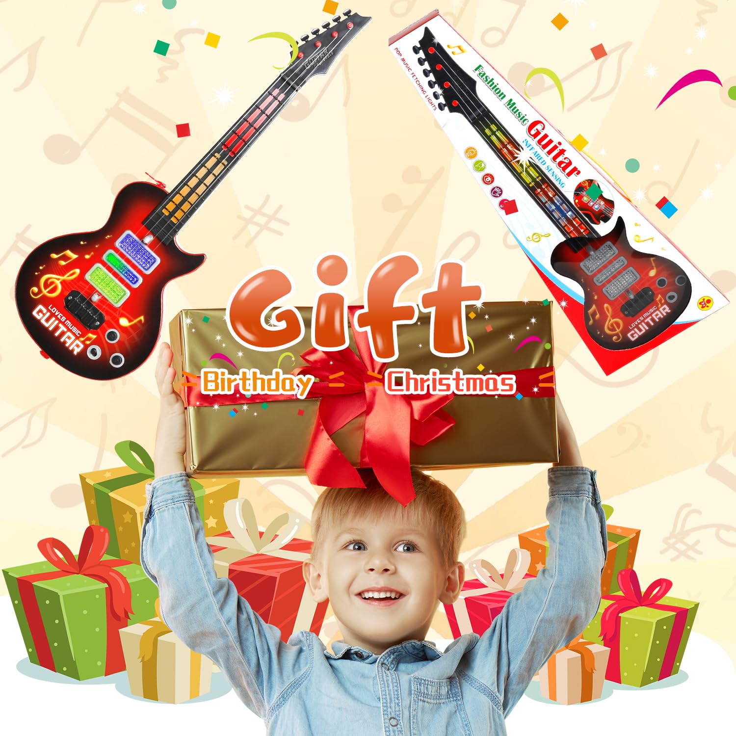 • Educational Musical Toys: The kids guitar toy built-in 8 kinds of tones or melody music. And the flash light will attracting kids' attention when press the button. Development the kids sensitivity of music. Also can exercise hand-eye coordination, motor coordination. Perfect solution for beginners who want to learn to play guitar and develop children stage performance. It is the best learning musical toys for 3 4 5 year old boys and girls.