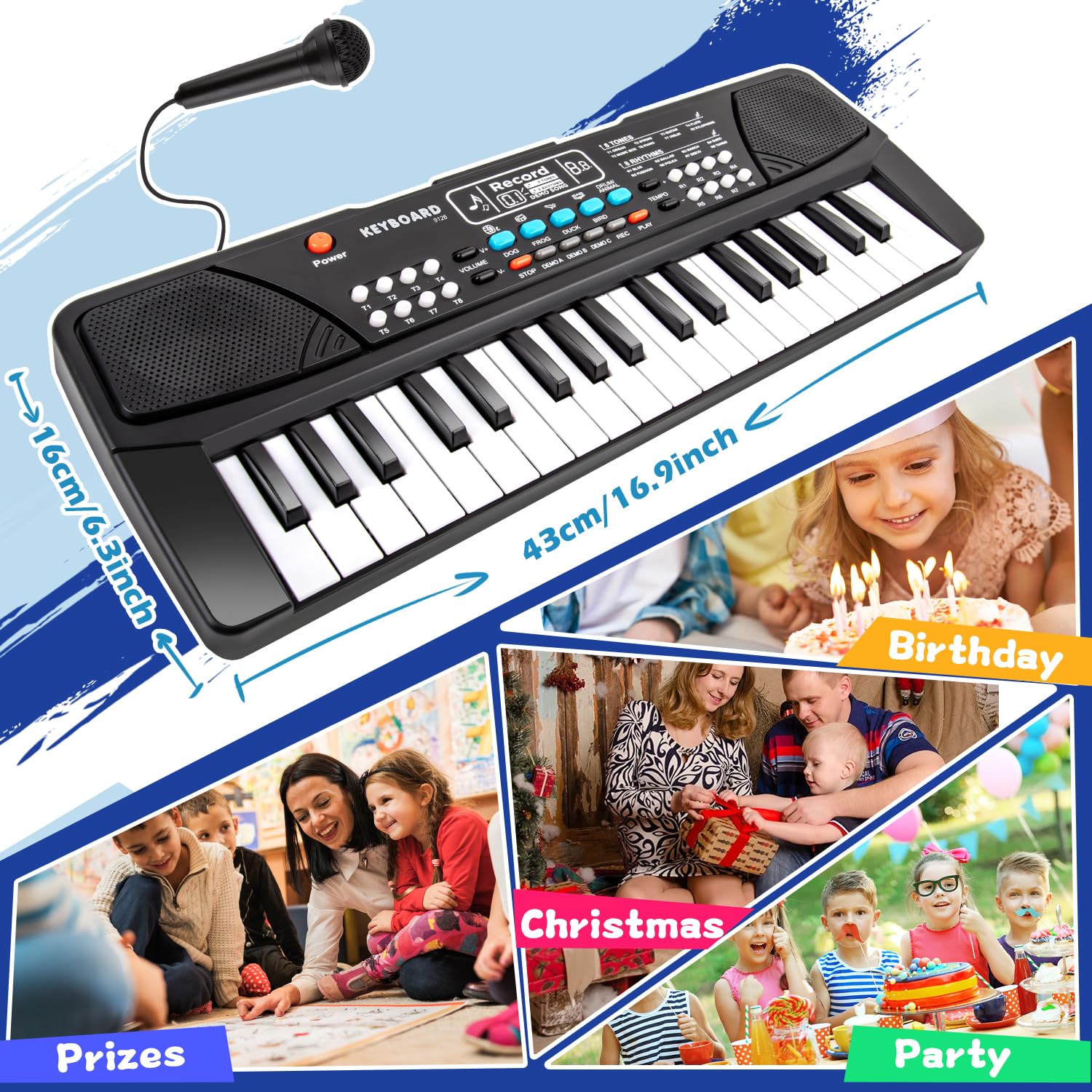 • Upgraded Multifunctional Piano: 37 Keys kids piano with 19 demos, 8 rhythms, 8 tones, 4 drum sounds and 4 animal sounds. The piano is equipped with stereo dual speakers, the cooperation of left and right speakers can form a stereo effect, which can bring an excellent sound experience to your kids and let your kids feel the charm of the piano. (NOTE: The microphone is behind the keyboard.)