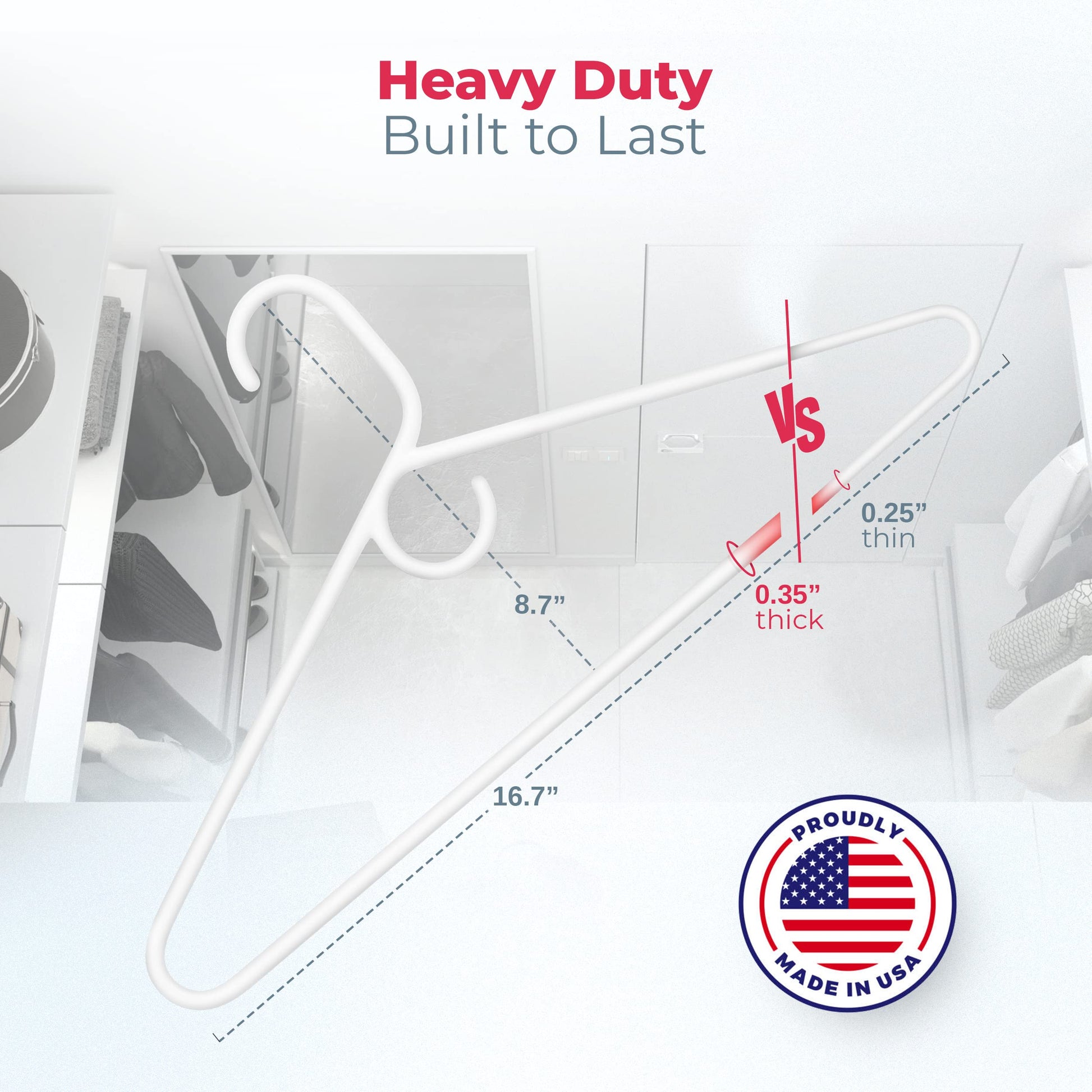 • HEAVY-DUTY CLOSET HANGERS - A plastic hangers bulk set proudly made and packaged in the USA. Try out a coat hangers 18 pack or choose from multiple pack sizes and colors guaranteed to perfectly fit any closet!