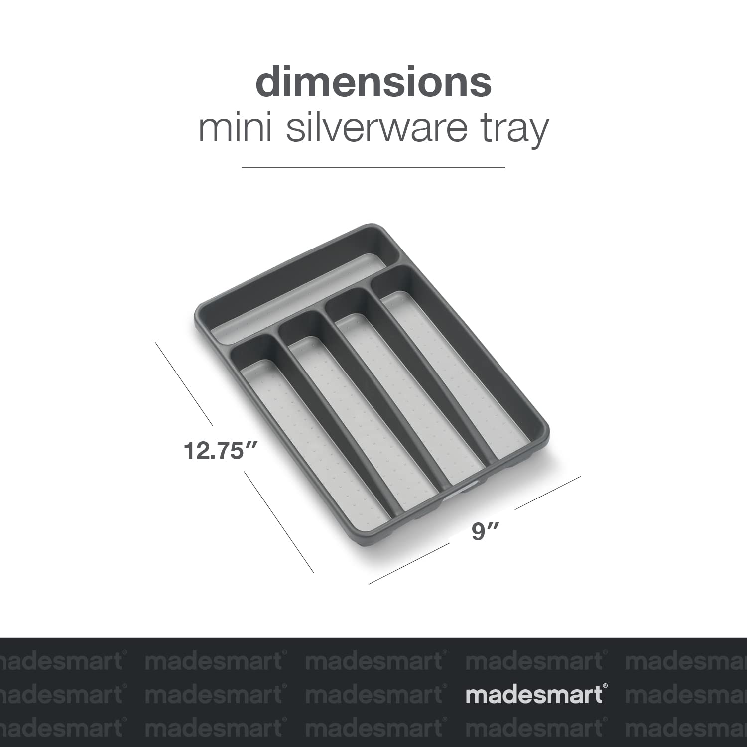 Details: Maximize the space in your kitchen with the Madesmart Mini Silverware Tray. Simple and convenient, this silverware tray easily fits in most kitchen drawers to offer a practical solution for silverware and utensil organization, keeping items easy to view and access. It's designed with 5 spacious compartments and branded icons that make it easy to organize your various kitchen cutlery and utensils by size and type, and the soft-grip surface lining and sturdy nonslip rubber feet keep your items neatly in place while ensuring that the organizer won't move around as you open and close the drawer. Ergonomic and durable, the tray features rounded corners to allow for easy use and make cleaning a breeze, and it's made from high-quality BPA-free plastic to provide years of quality use. The compact silverware tray measures 12.75" x 9" x 1.88" (32.39 cm. x 22.86 cm. x 7.76 cm.), making it perfect for apartments with smaller drawers while still offering plenty of space for silverware.