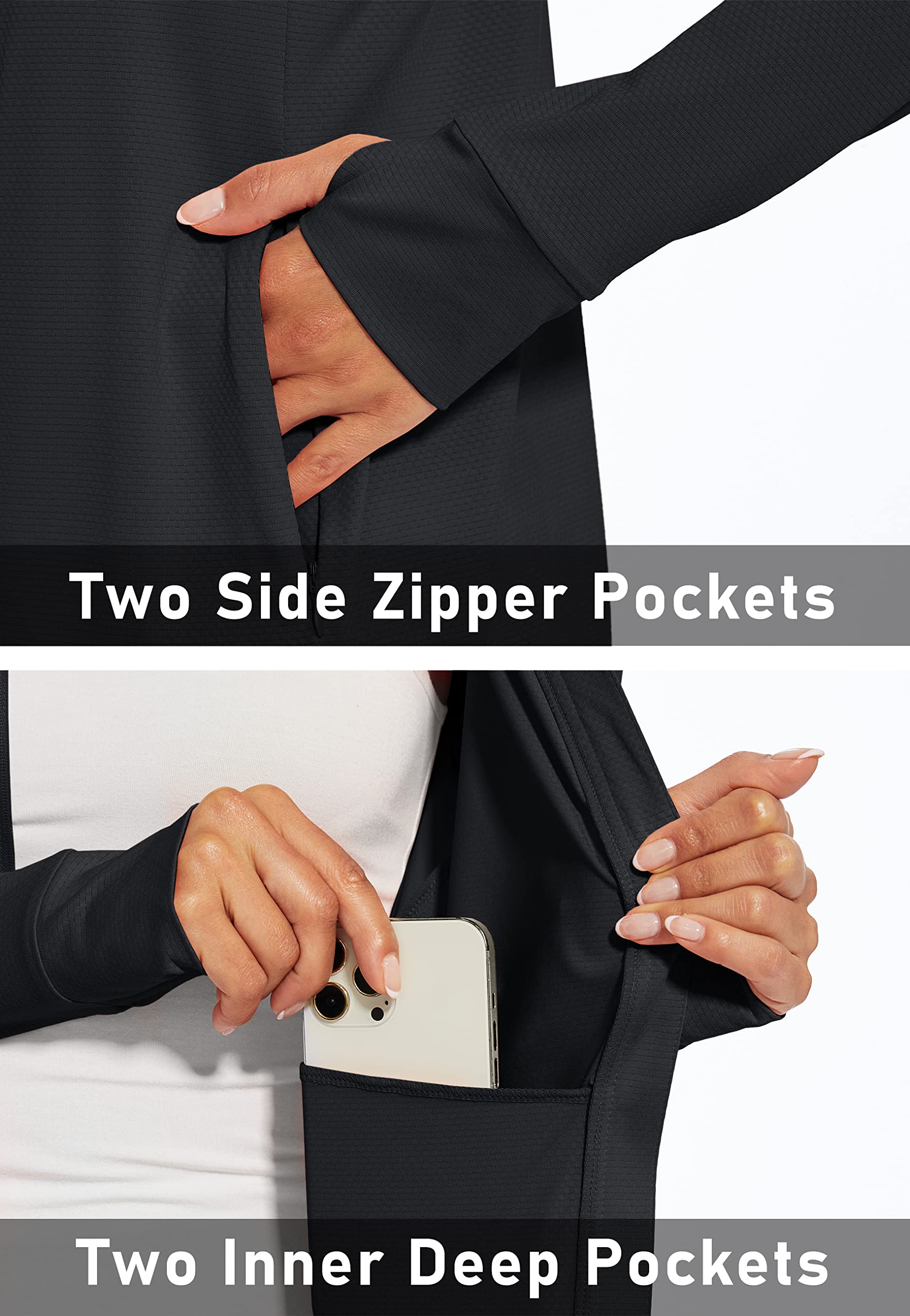 MAGCOMSEN Women's UPF 50+ Lightweight Athletic Jacket Sun Protection Full Zip Long Sleeve Shirts Hiking Outdoor Pockets Black L