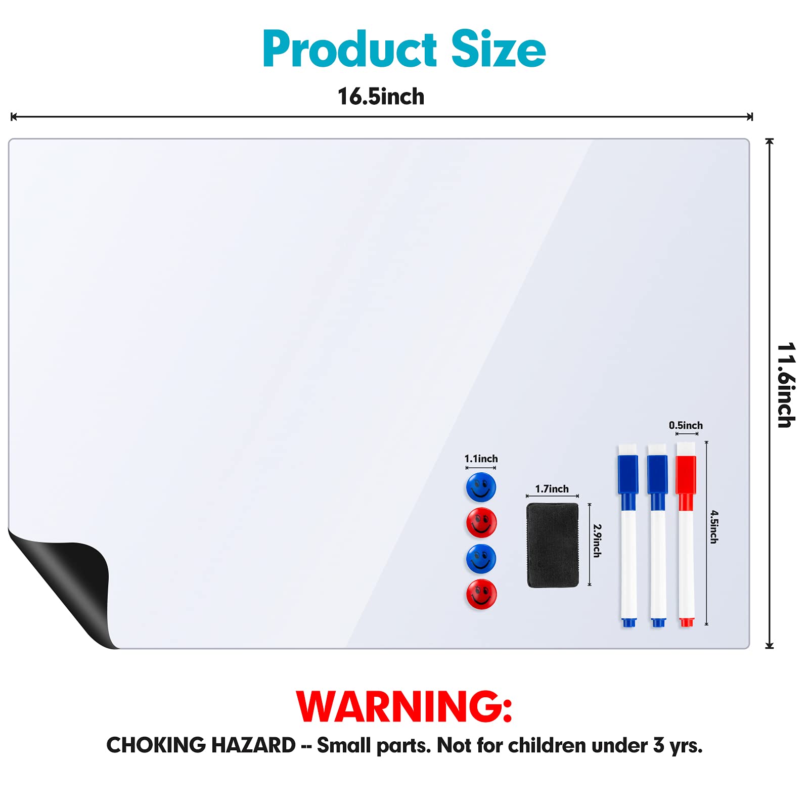 • 【THE RIGHT SIZE】 – Includes 2 Pack, Each Whiteboard Size: 11 X 16 inches, plenty of writing space. If you need a larger one, you can put the two together and use it as one. You can also cut it into any size or shape with scissor depends on your needs. So easy to turn your fridge, office cabinet into a planner whiteboard! WARNING: CHOKING HAZARD -- Small parts. Not for children under 3 yrs.