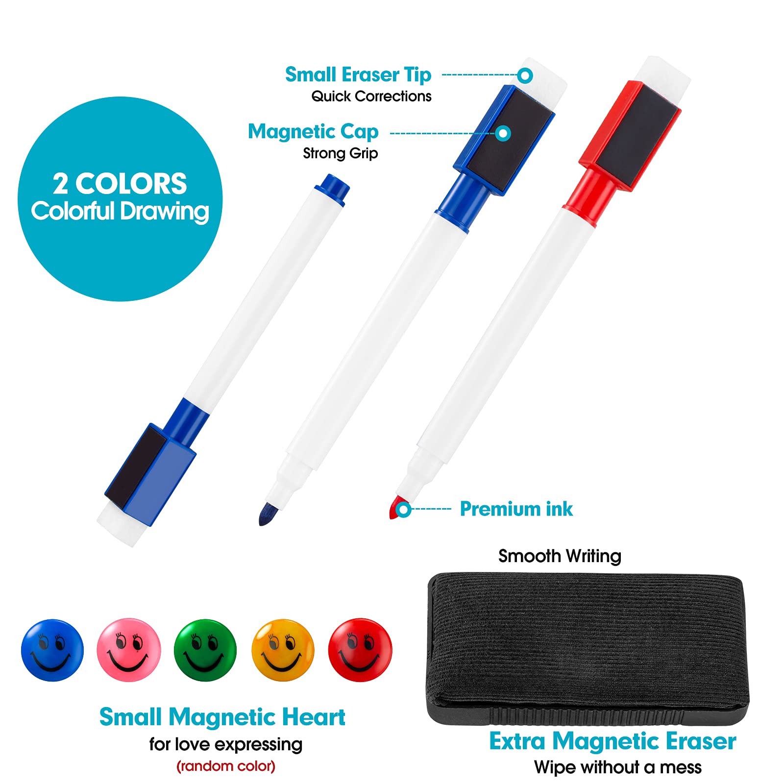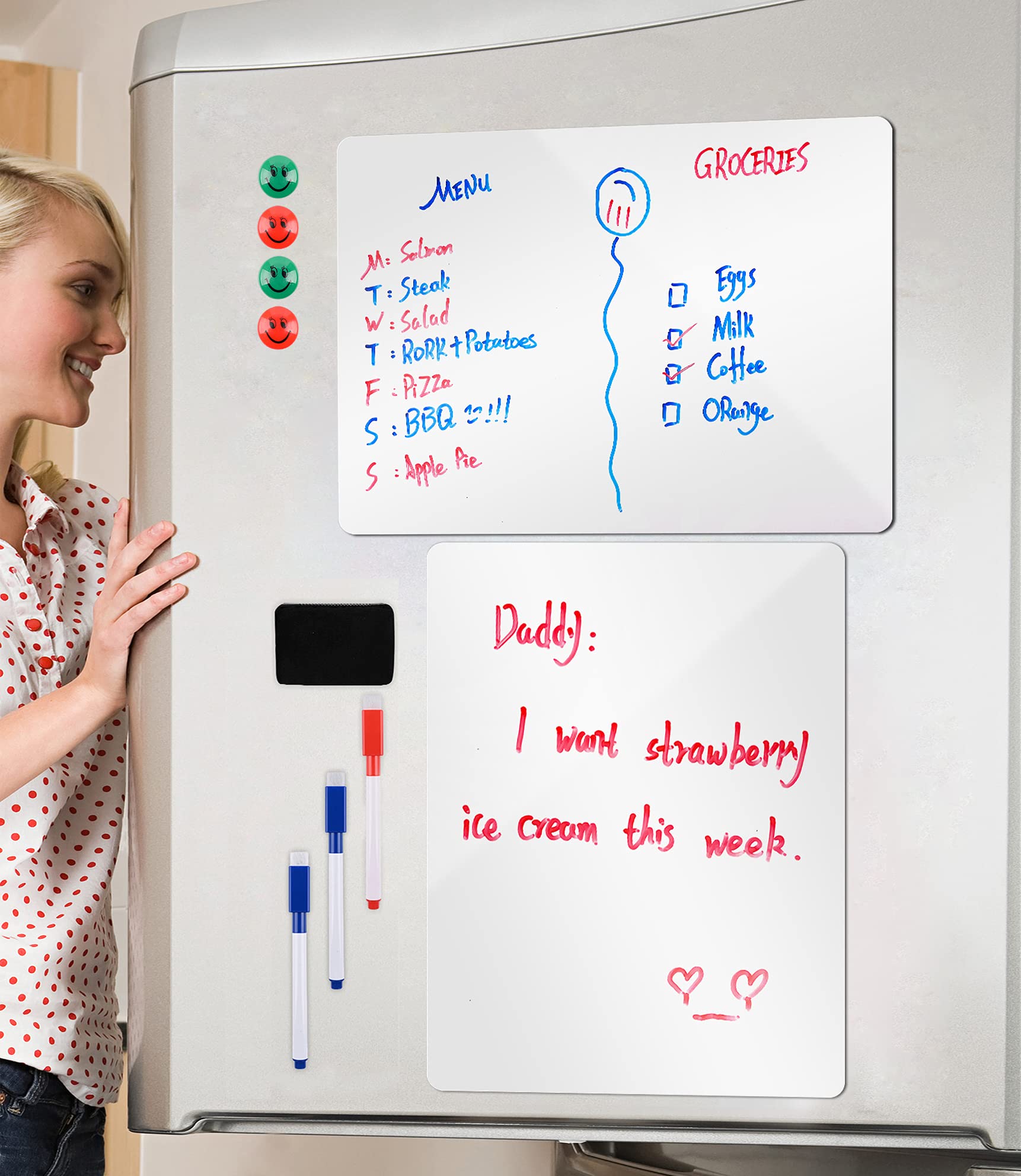 • 【WHAT YOU GET】 – 2 dry erase white boards, 4 magnets, 3 colorful fine tip dry erase markers (2 blue + 1 red) and a magnetic eraser are included, enough to help you to do some plan and marks. Everything is magnetic that you can hold picture or notes with the magnets on your fridge and all accessories will won’t lose easily. Thank you so much for your great support on us. I understand your concern about the product quality, 7x24 hours customer service ready for you, No-Worry Purchase!