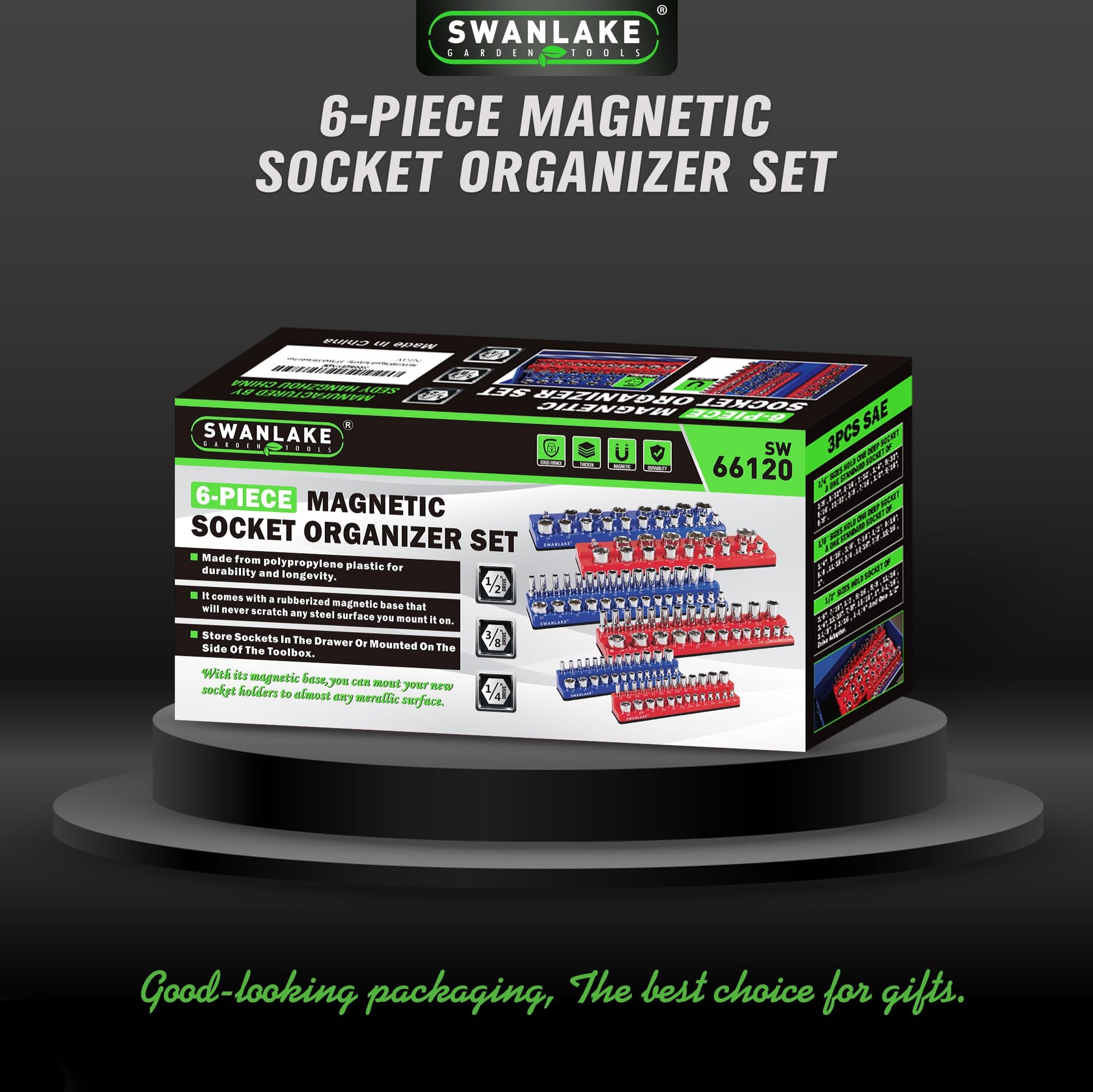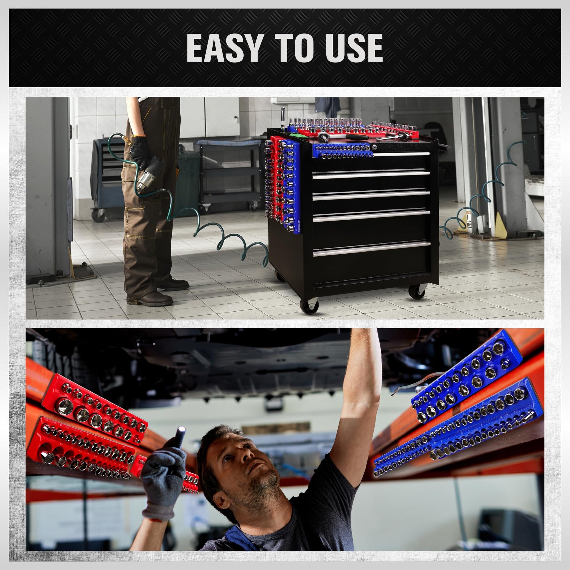 • Includes 3pcs blue metric magnetic socket organizers and 3pcs red SAE magnetic socket organizers for 1/4', 3/8', and 1/2' drives.