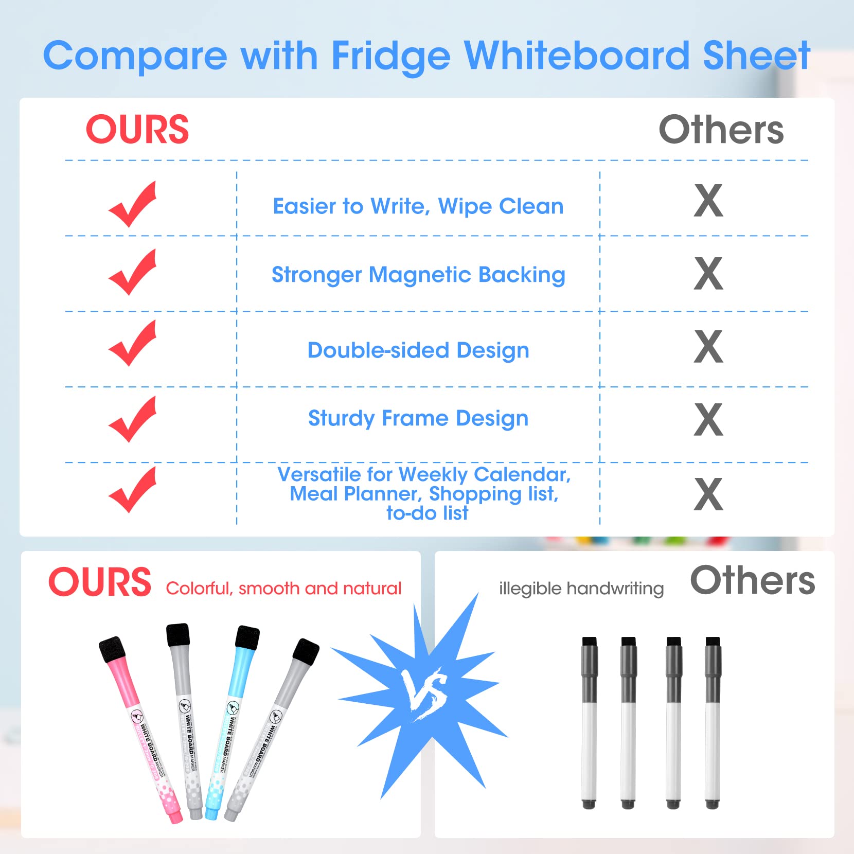 • 【Smooth Writing & Easy to Wipe.】Comes with 4pcs magnetic dry erase markers with eraser cap (2 Black, 1 Blue and1 Pink) , the upgraded smooth and magnetic writing surface makes the whiteboard easy to write on anything you want. And its frame design will avoid writing to the fridge surface when you write on the board. Words on the whiteboard can be easily erased without leaving any stains. No ghosting with markers. Note: the pen holders are used for transpotation and not used on the fridge.