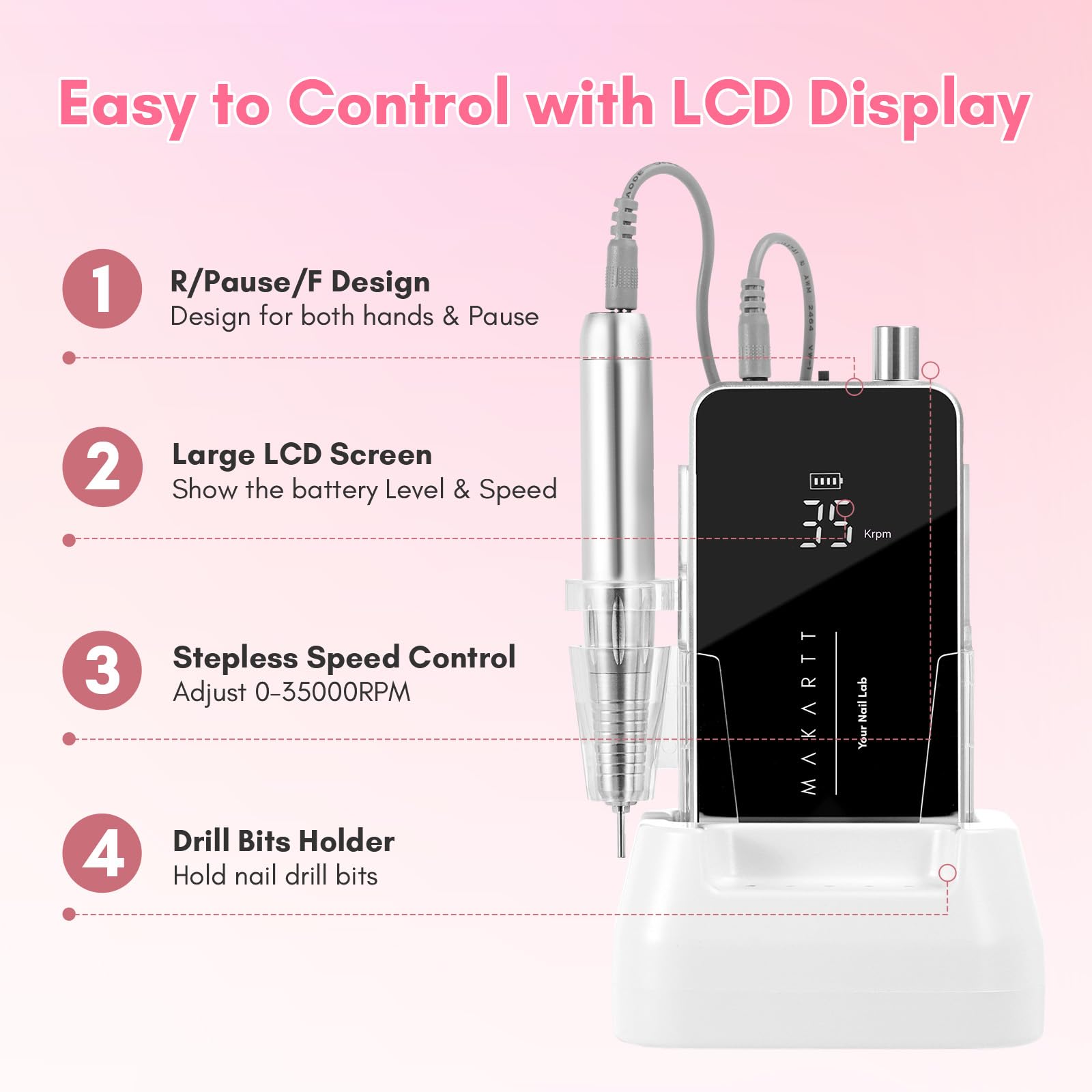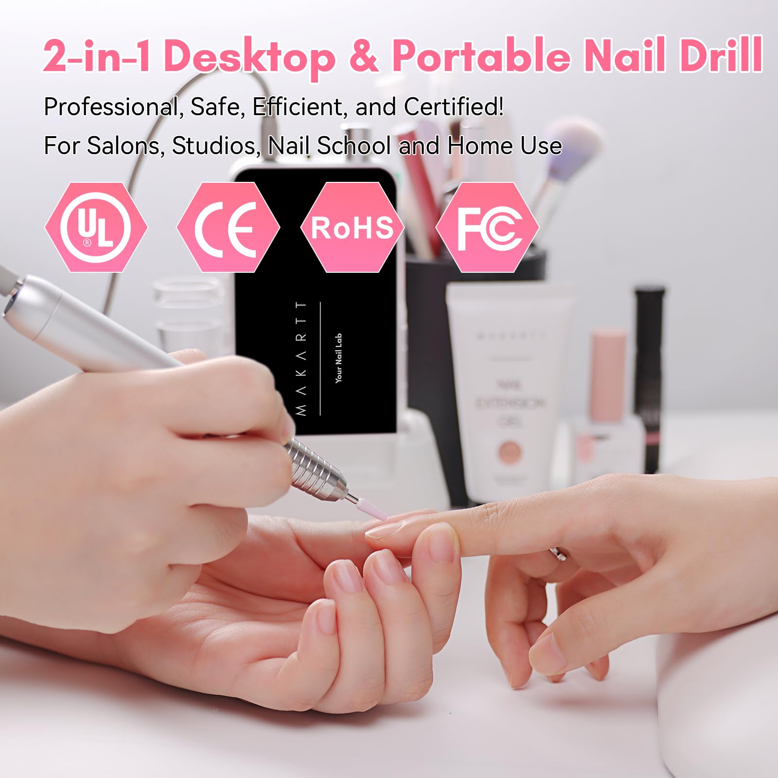 • 2-in-1 Desktop & Portable Design: The Makartt electric nail drill features a detachable body and smart charging base for stable desktop use or portability. Durable housing and built-in overload protection ensure long-term reliability. Certified by UL, FCC, CE, and RoHS.