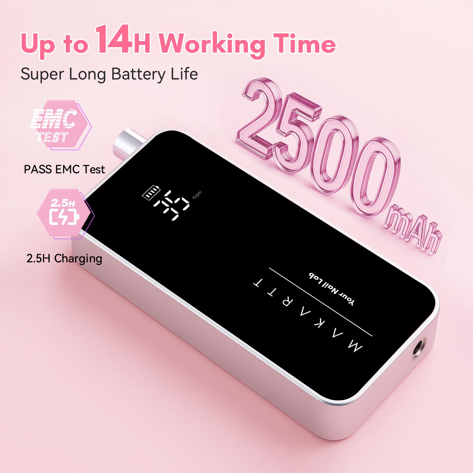 • 2500mAh Rechargeable Battery: Brushless nail drill delivers up to 14 hours of use on a full 2.5-hour charge. The nail filer electric is ideal for salons, travel, home or busy schedules. (Use original adapter for optimal performance.)
