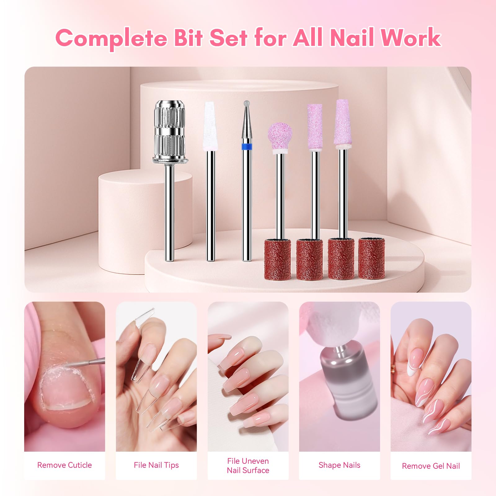 • Complete Nail Bit Set: The acrylic nail drill kit includes 6 versatile nail drill bits and 6 sanding bands for shaping, filing, and gel removal. Built-in base holder keeps everything organized and within reach.