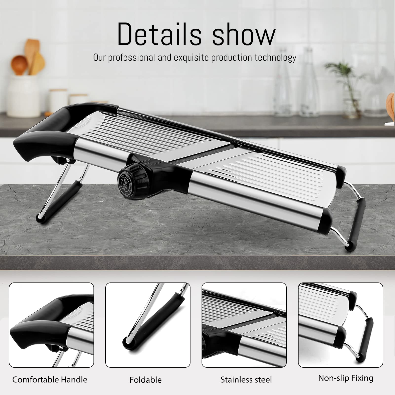 • 【Best Chopper for Time Saving】The blades are built-in and do not require extra space for storage. The handle and feet of the food slicer are foldable for easy storage in a drawer. The mandolin slicer is easy to clean. After use, just rinse the food residue on the potato slicer under running water, and let it dry naturally. It is also dishwasher safe.