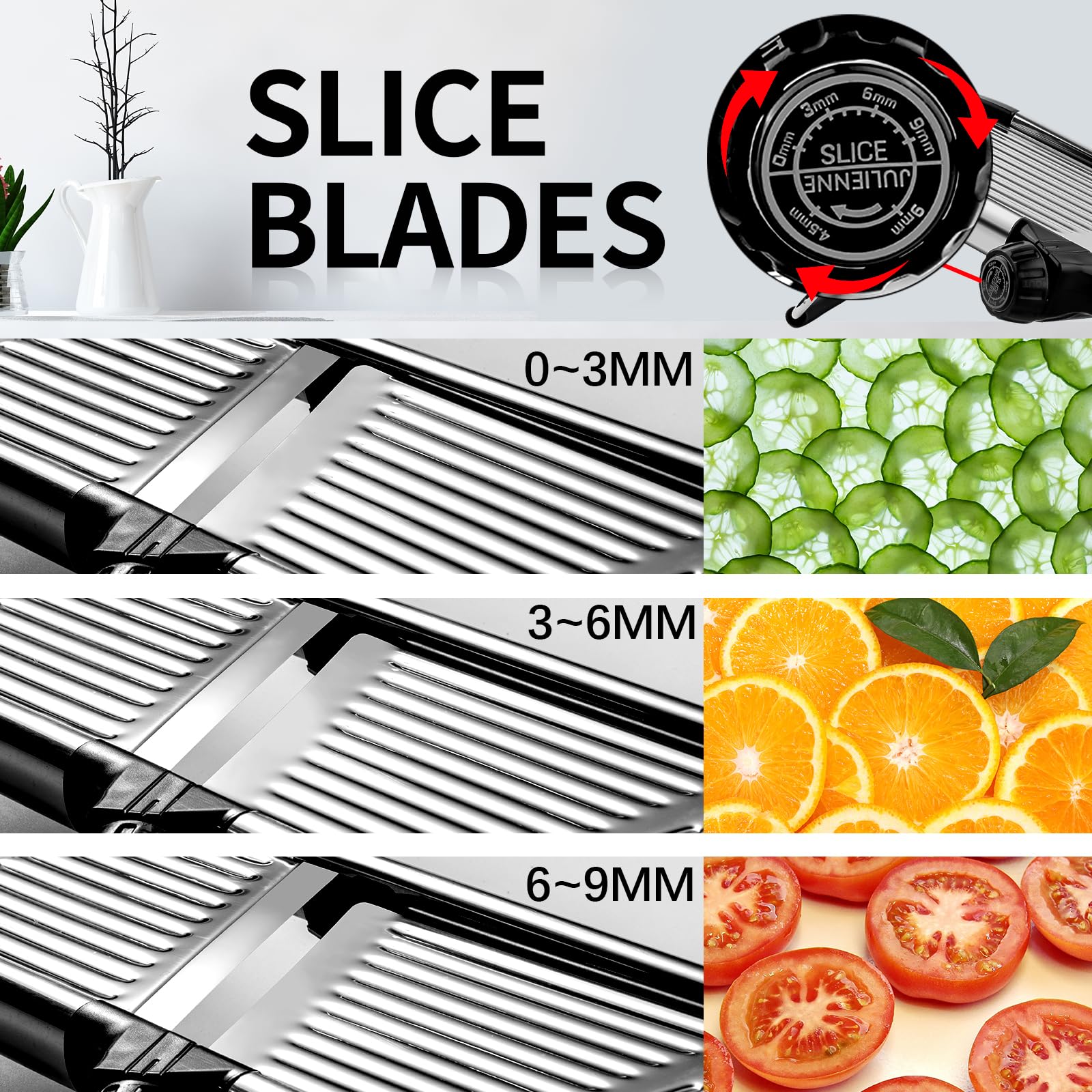 • 【Adjustable Vegetable Slicer】All slicing options are built-in on our mandolin, no hunting the blads in your kitchen junk drawer anymore! There is a slice option from 1 to 9mm thick and two julienne options settings- 4.5mm and 9mm. You can use the adjustable slicer vegetable cutter to make french fries, waffles, vegetable salad, etc.