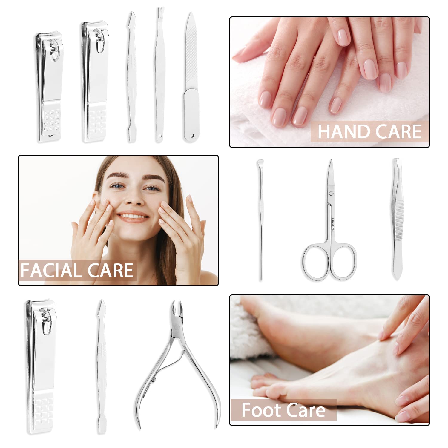 • 【MULTIFUNCTION PEDICURE TOOLS & MANICURE TOOLS】: FAMILIFE 9PCS nail set has everything you need for hand care, facial care, and foot care.1x Fingernail Clipper, 1xToenail Clipper, 1xCuticle Nipper,1xCuticle Knife, 1xDouble-sided Push Stick, 1xManicure Scissors, 1xNail File,1xTweezers, 1x Ear Pick. Your best choice for high-quality large accessories
