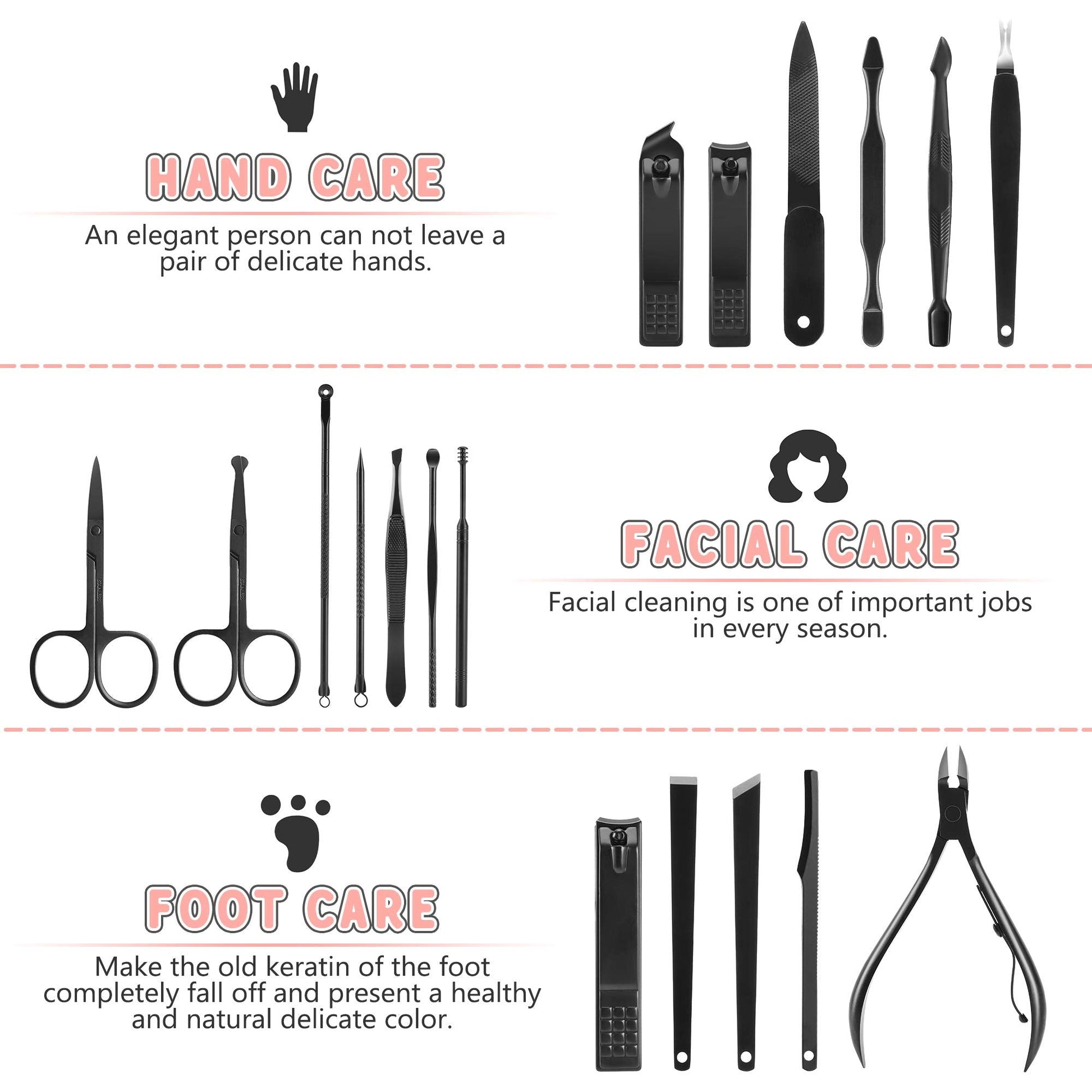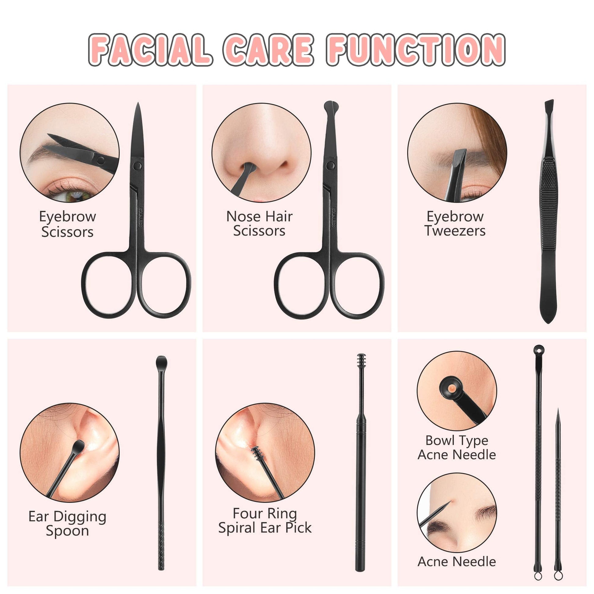 19pcs in 1 Grooming Kit - All tools you need in this Facial Care Tools: Ear Digging Spoon: remove earwax from ear canal Four Ring Spiral Ear Pick: remove large chunks of earwax Eyebrow Scissors: trim eyebrow Eyebrow Tweezers: shape up brows flawlessly by remove unwanted eyebrow Acne Needle: remove acne Bowl Type Acne Needle: remove blackhead, acne Nose Hair Scissors: trim nose hairs Hand Care Tools: Medium Nail Clippers: trim finger nails Oblique Nail Clippers: trim nail thorns, the corner of nails Nail File: Make nails rounded, smooth Nail Cleaner: clean dirt in nail Nail Scraper: trim nail keratin and remove scrape nail polish V-Shaped Cuticle Trimmer: trim surface, calluses, dead skin, etc Feet Care Tools: Large Nail Clippers: trim hard and thick toenails Cuticle Nipper: cut off dead skin and spurs Curved Pedicure Knife: pedicure, dead skin around the feet, etc Pedicure Knife: clean dead skin, thick calluses of feet Oblique Pedicure Knife: trim onychomycosis, dead skin between nails of feet Cleaning Tools: Cleaning Brush: clean sharp tools, leather case