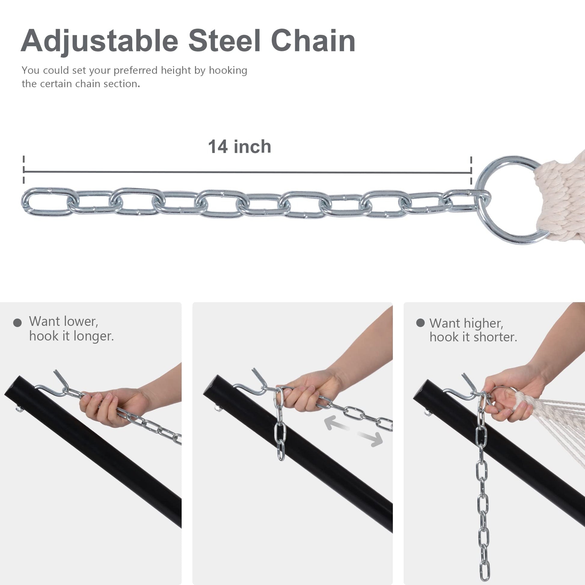 • Large Size & Comfortable: Mansion Home hammock with spreader bar is designed to safely support a maximum capacity of 450 pounds, which is large enough to accommodate two adults. The length from loop to loop is 11.48 feet while the hammock bed resting area is 75 inches Long x 55 inches wide. The total length is 13.81ft with two 14-inch steel chain links. Comes with a large and soft pillow, you could enjoy your outdoor time comfortably and leisurely