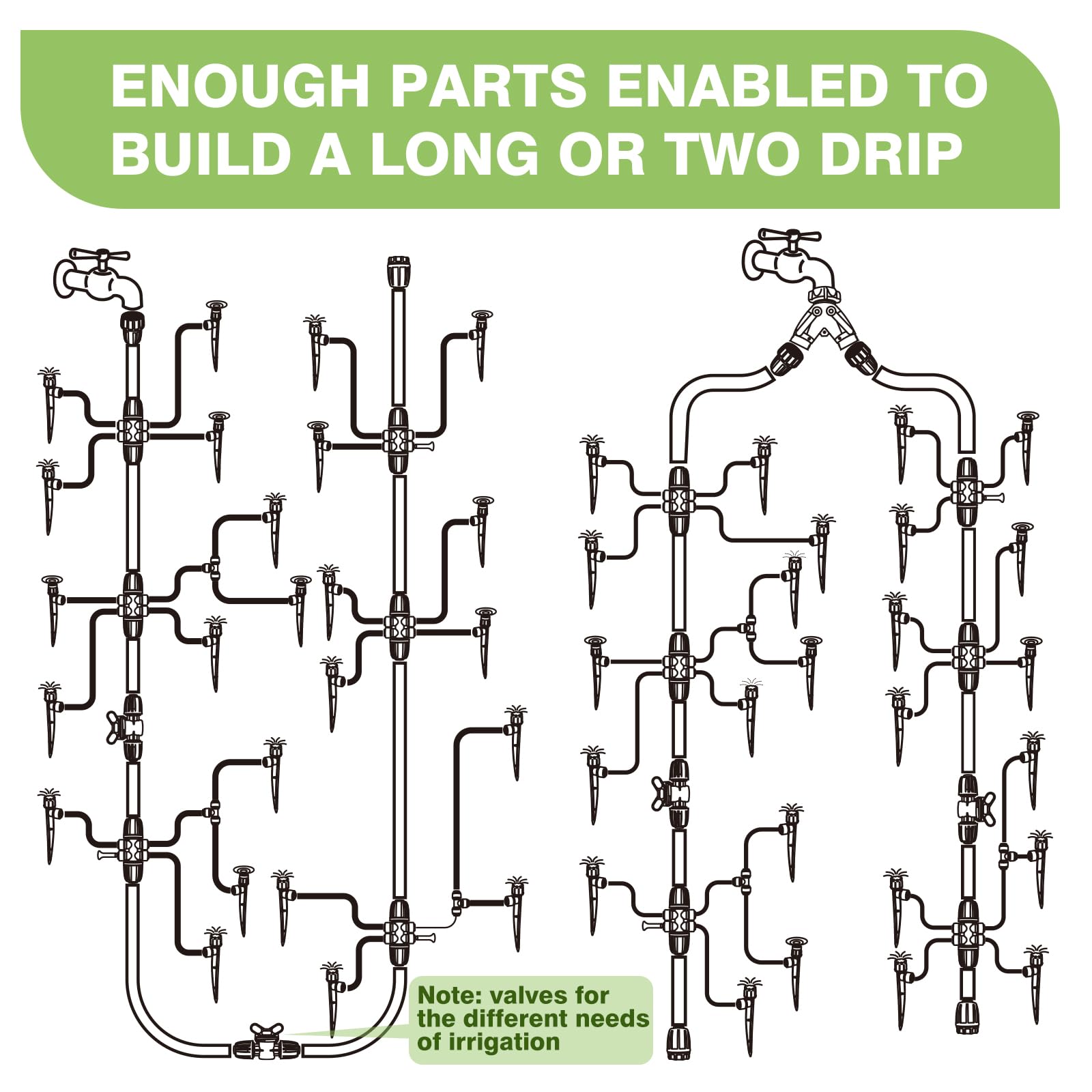 • Enhanced Tubing Design: Our main tubing has been upgraded to withstand higher water pressure, ensuring durability and reliability. With a generous 40FT length, which can be easily divided into two main tubes, and two faucet connectors included, setting up multiple drip irrigation systems is a breeze.