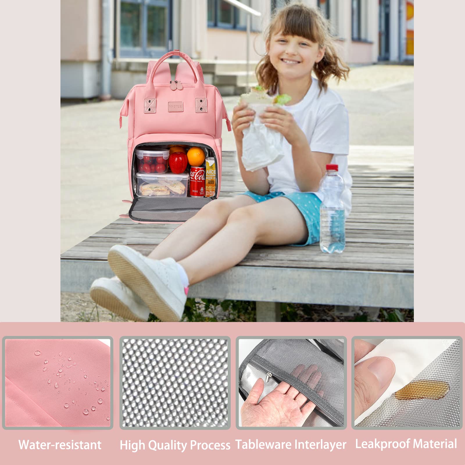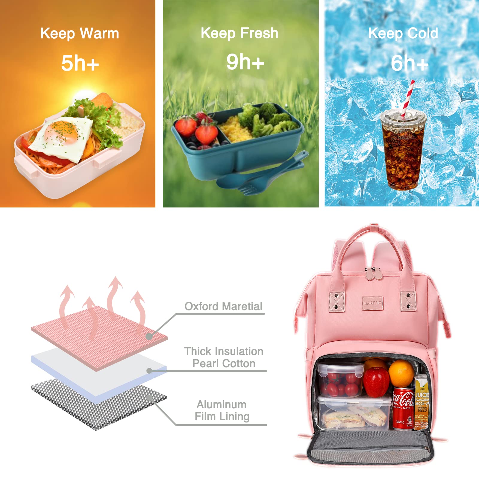 • πŸŽ€ [Insulated Lunch Box] The women pink laptop backpack contains a detachable insulated lunch bag, which is made of cleanable thickened aluminum foil to keep food warm/cold for 3-5 hrs. It has a Interior mesh zippered pocket to store knives, forks.