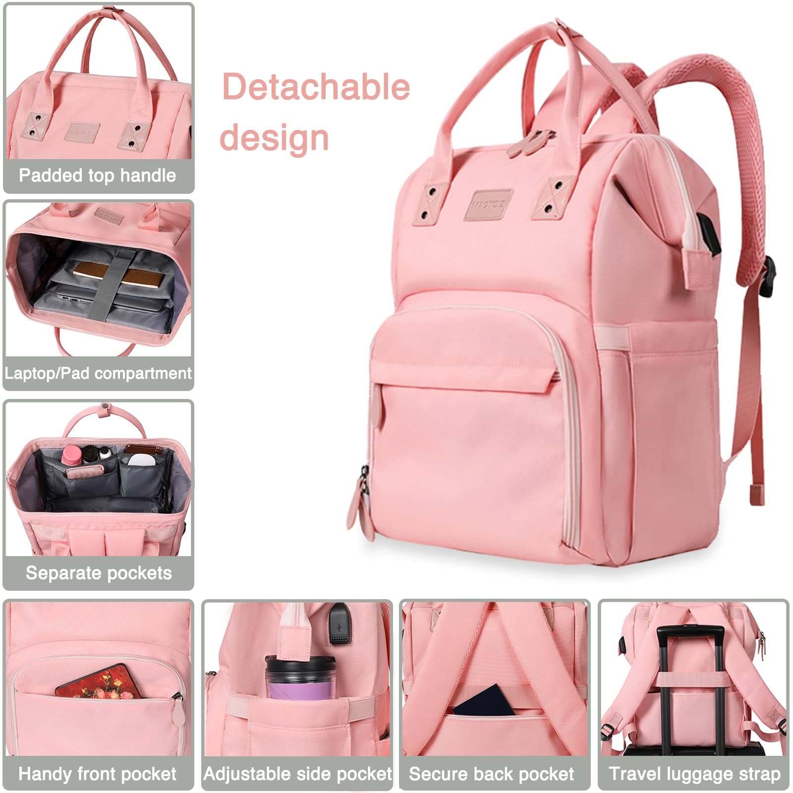 • πŸŽ€ [Travel Friendly] The 15.6 inch pink laptop backpack for women with insulated pocket is great for daily use and trip. It contains external USB charging port and inside charging cable, luggage straps and anti-theft pocket. Women lunch laptop backpacks for work, business, office, picnic, hiking, beach, travel