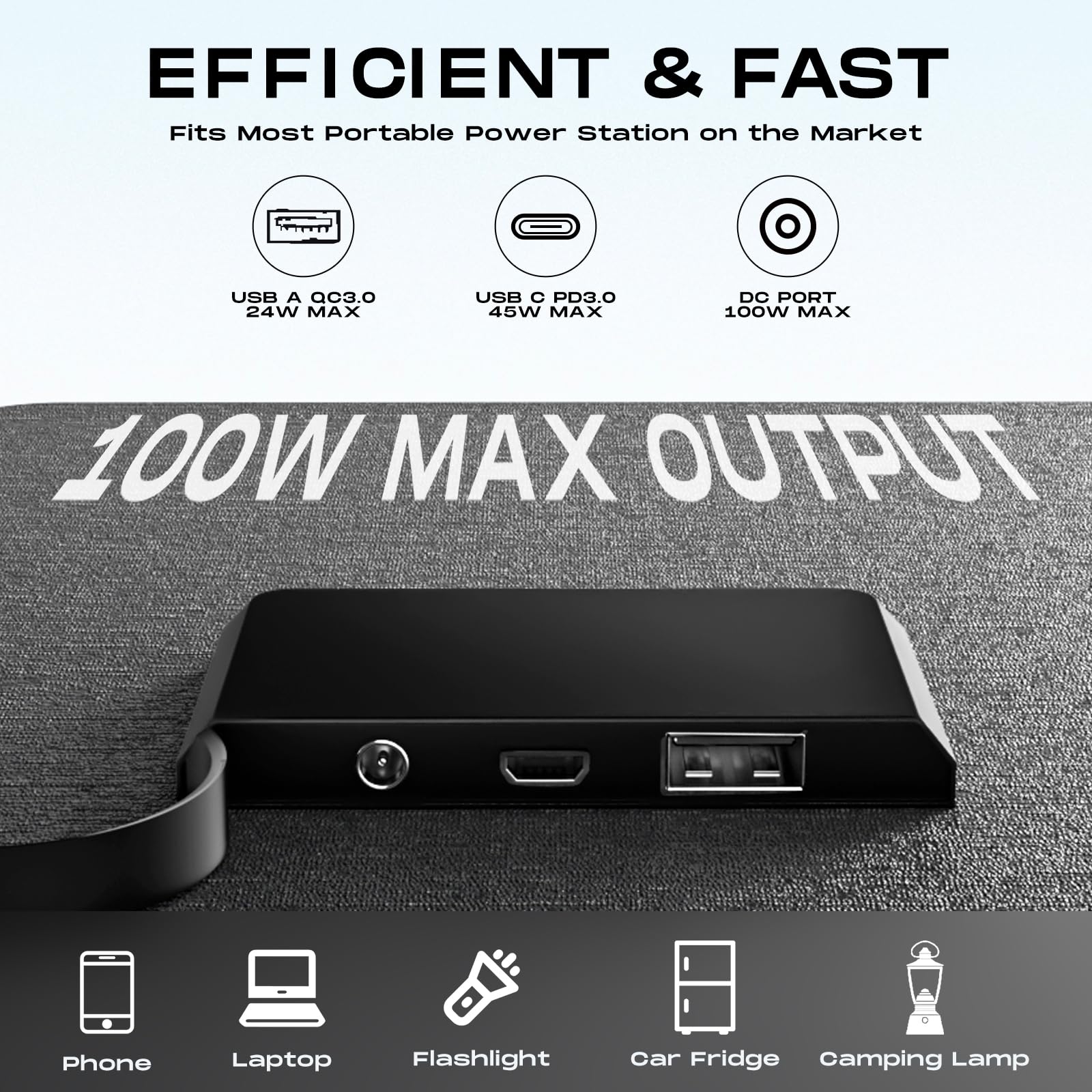 • PLEASE NOTE: Certain portable power stations have a maximum input power limit. Even when using our 100W solar panel under ideal sunlight conditions, the energy intake of these staions may not surpass their set maximum input limit, which could be below 100W. This scenario does not reflect a deficiency in the power output of our 100 watt solar panel, Prior to ordering, we strongly advise you to confrim the specifications of your power station, particularly checking for any maximum input power restritions.