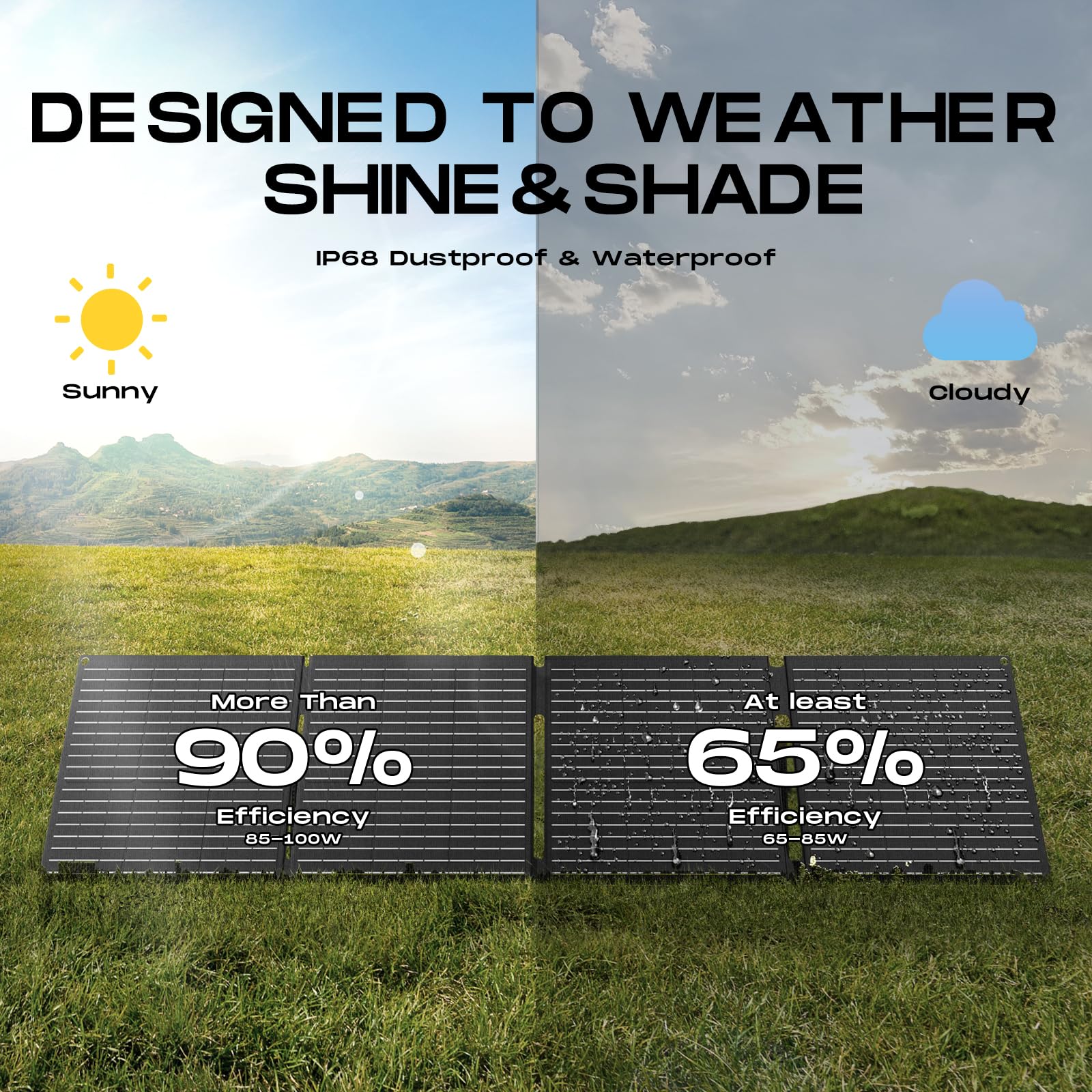 • POWER IN SUN OR SHADE: This 100W folding solar panel portable camping essentials remains efficient even on cloudy days. It delivers 80–100W in full sunlight at an optimal 45–65° angle, and 65–70W in cloudy conditions—providing reliable power in any weather.