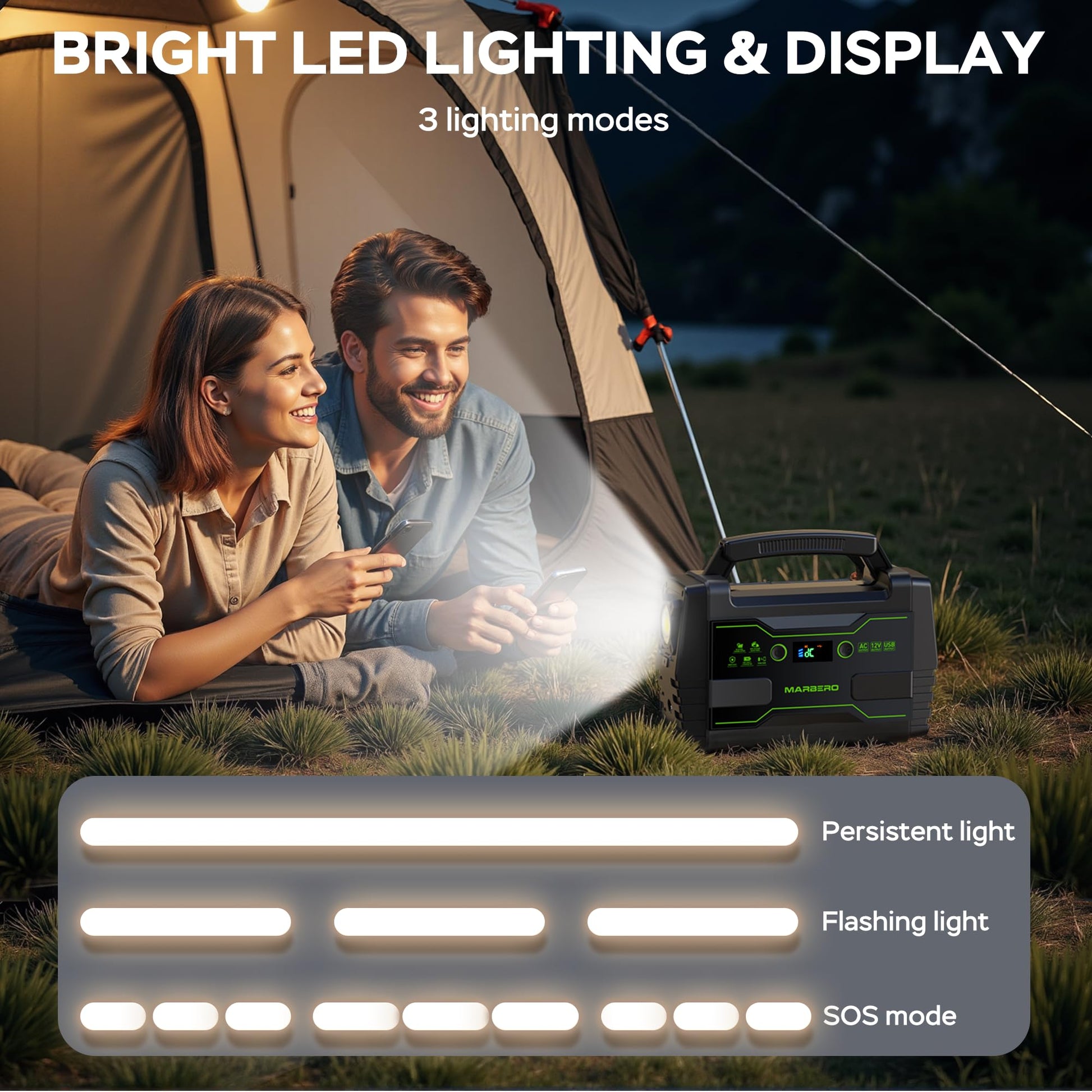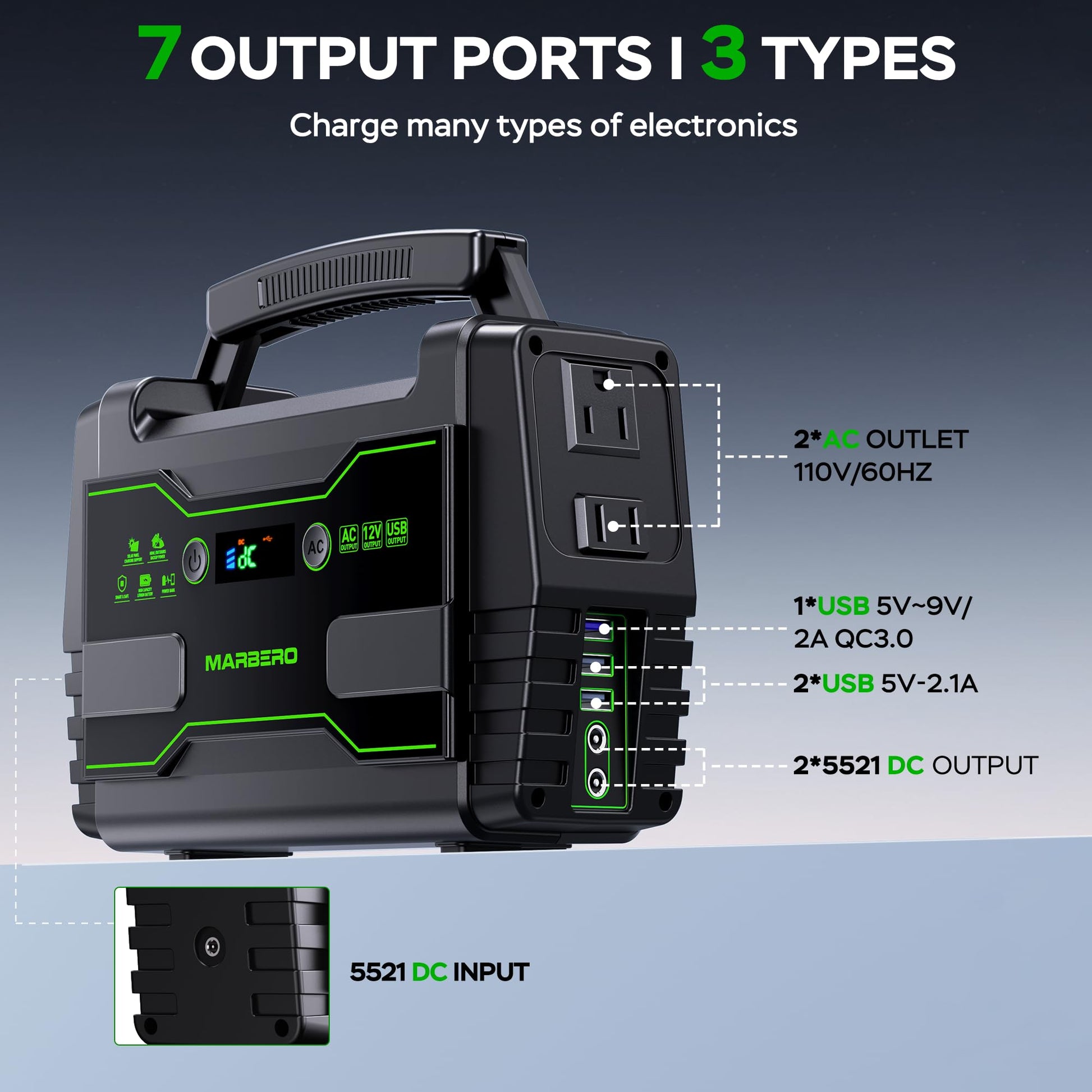 • WHAT YOU GET: 1 x MARBERO M155SL30 Portable Power Station ,1x 15V/2A Power Adapter ,1 x Cigarette Lighter Adapter ,1 x MARBERO 30W Solar Panel, 1 x Car Charger, 1 x User Manual
