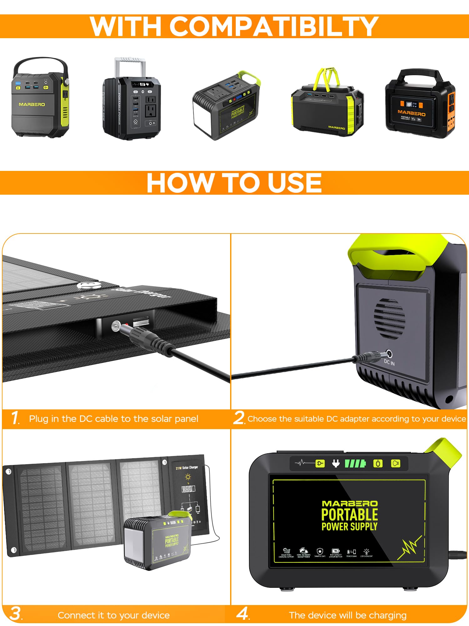 • PACKAGE INCLUDES: 1*MARBERO Foldable Solar Panel 21W, 1*DC 5521 Cable, 3*Interchangeable DC Adapters, 1*User Manual, 2*Carabiners. NOTE: Any clouds, the angle toward sunlight, operating temperature and sunlight intensity will affect the real output, we don't suggest you use this foldable solar panel inside of a window or windscreen.