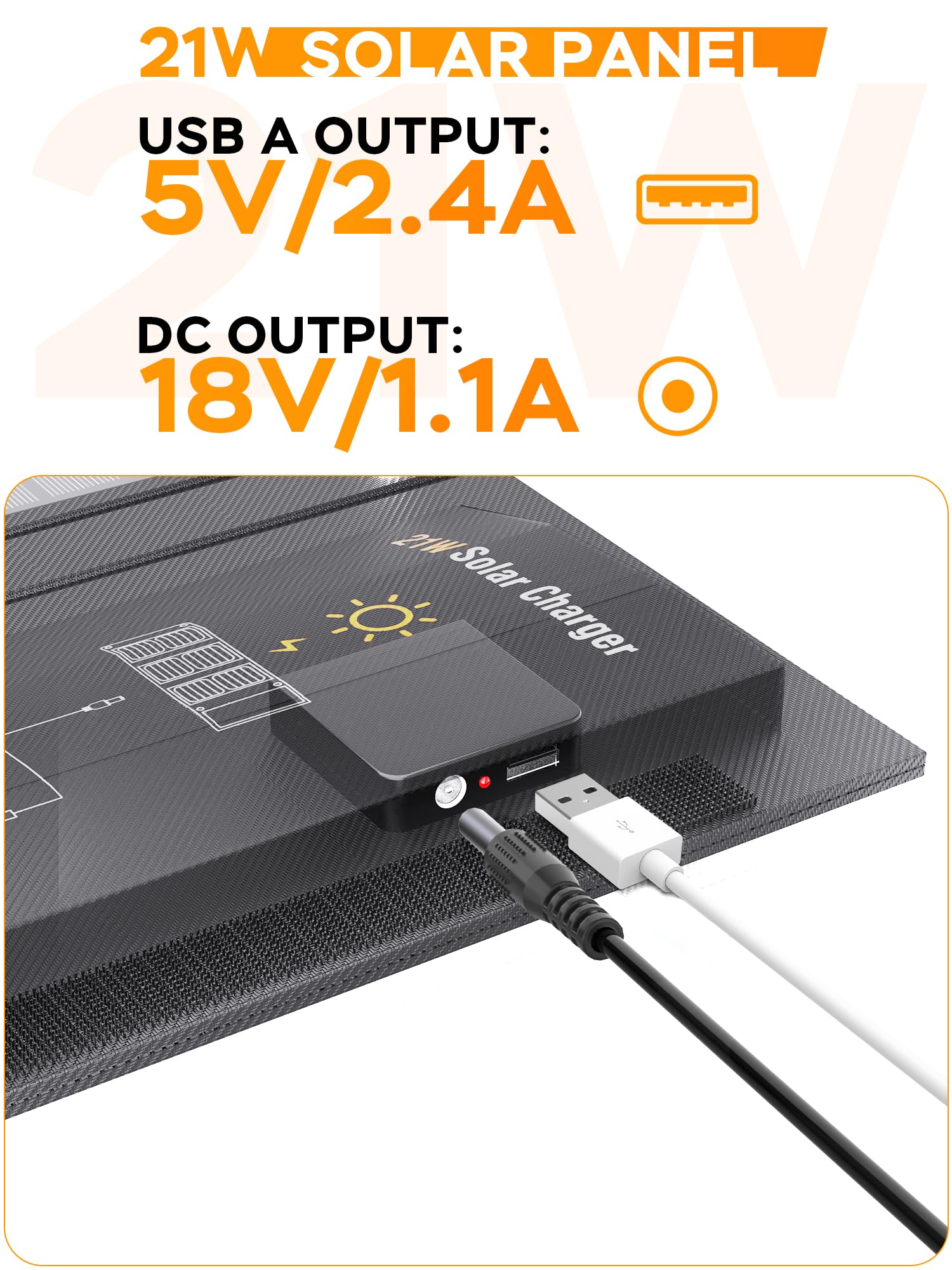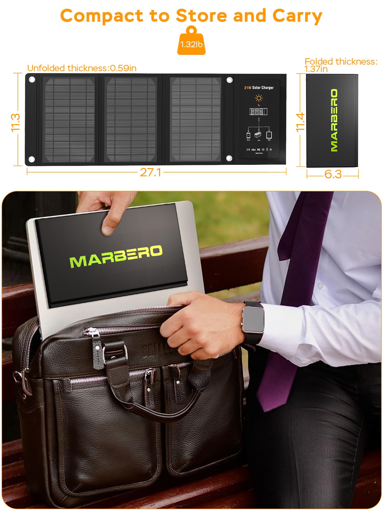 • WIDE COMPATIBILITY: The USB A and DC ports are built into the power box of the MARBERO 21-watt portable foldable solar panel charger, making it perfect for charging your smartphones, tablets, laptops, power bank, speaker, portable power stations, and more. This portable solar panel, designed for camping and outdoor use, offers a reliable solar panel charging solution wherever you go, whether you're using it as a camping solar panel or for general on-the-go power needs. Our portable solar charger can't store electricity and can't charge laptops and power station.