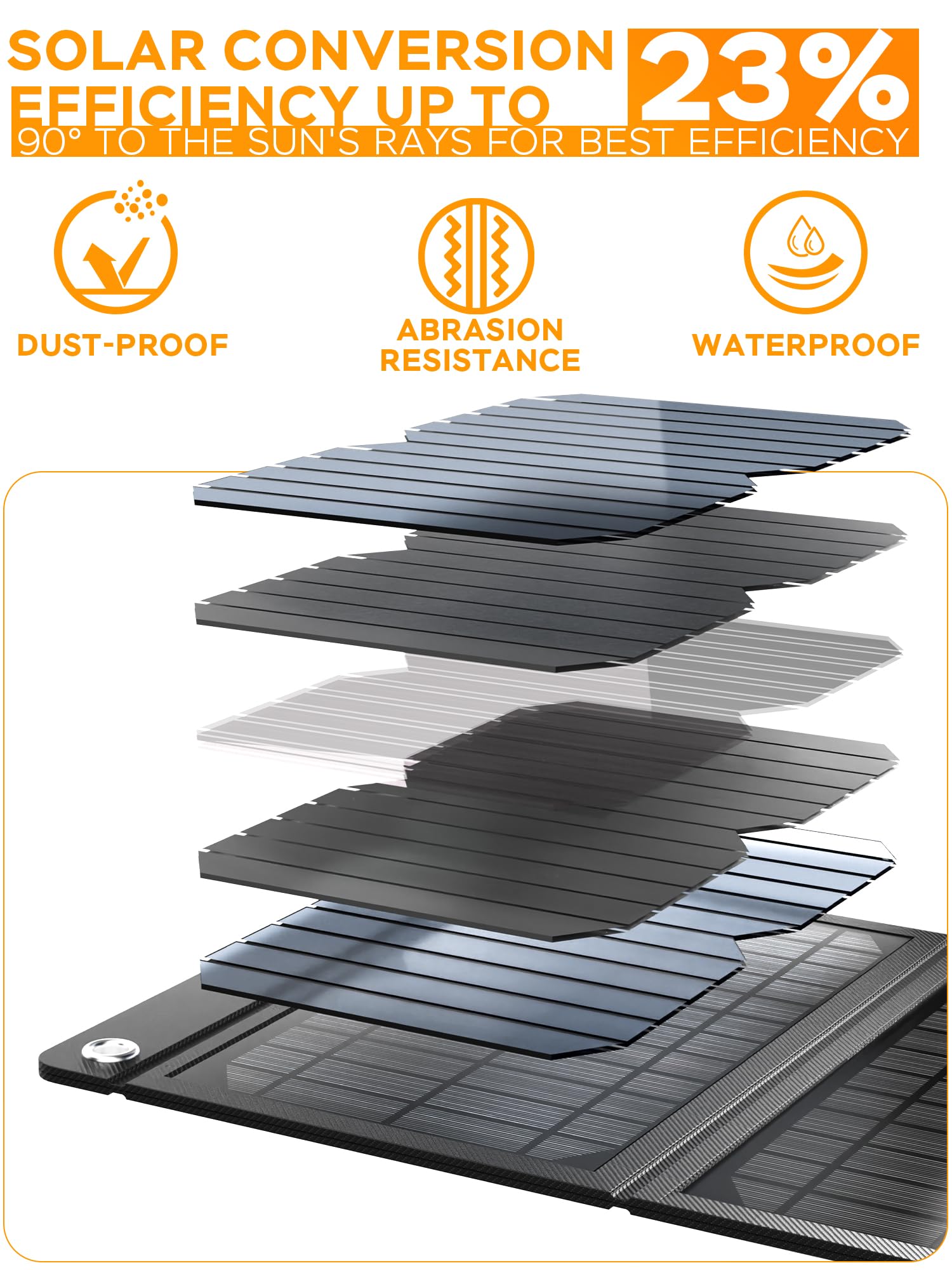 • PORTABLE, FOLDABLE & EASY TO CARRY: The MARBERO portable solar panel is compact and lightweight, with a folded size of 11.4" x 6.3" x 1.3" and weighing just 1.32 lbs—smaller than an iPad Pro. It easily fits into any camping backpack or hiking daypack, or can be carried by hand, making it perfect for outdoor activities like camping, traveling, or any occasion when you need it. Designed with 4 attachment holes, this foldable solar charger can be conveniently hung anywhere using the included carabiners.