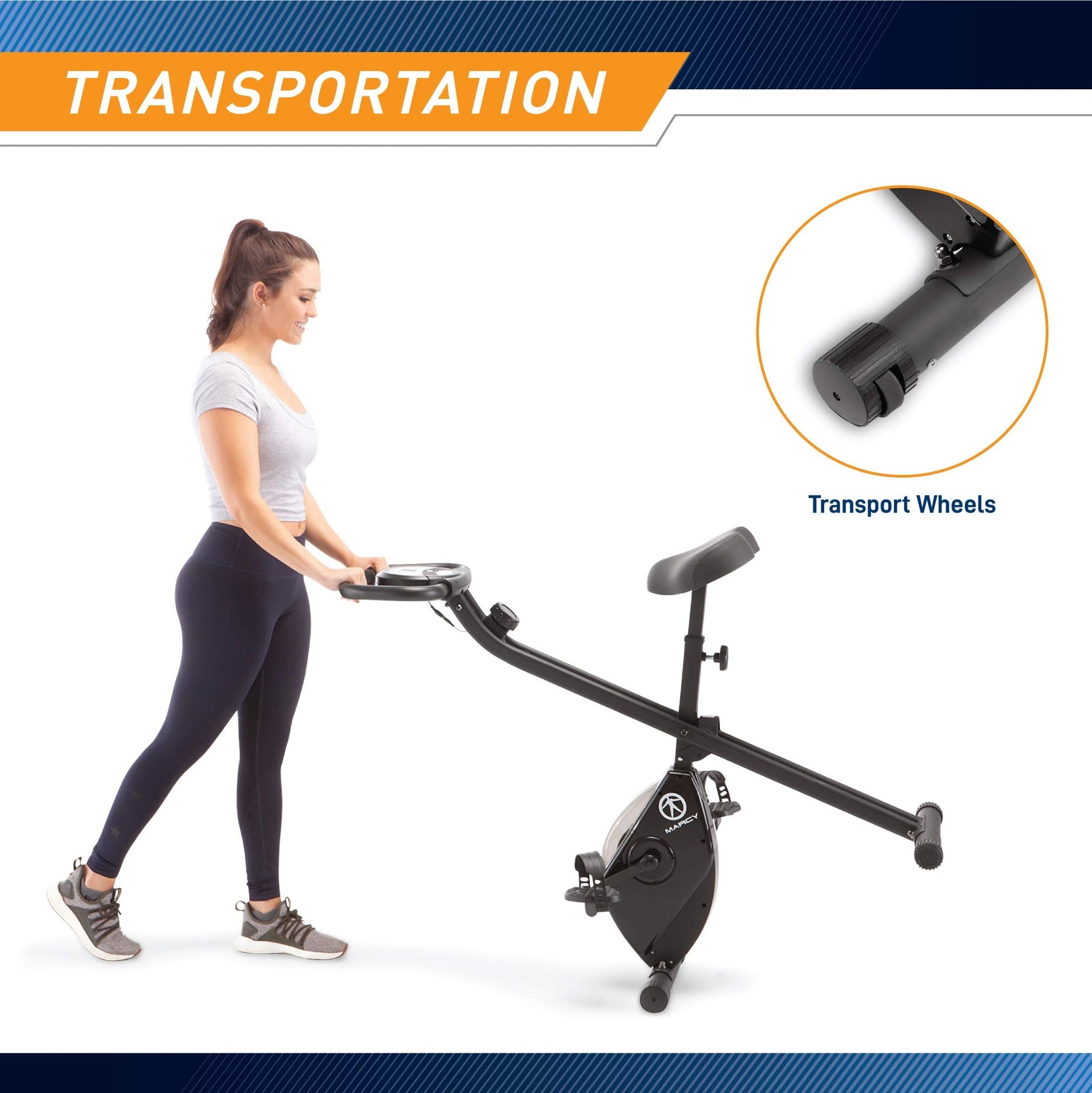 The assembled dimension is 33.5” length x 18.25” width x 43.75” height; this small exercises bike has a foldable frame that can be collapsed and its transport wheels allows you to move it anywhere in the home gym or at home easily and conveniently store it in a designated area.
