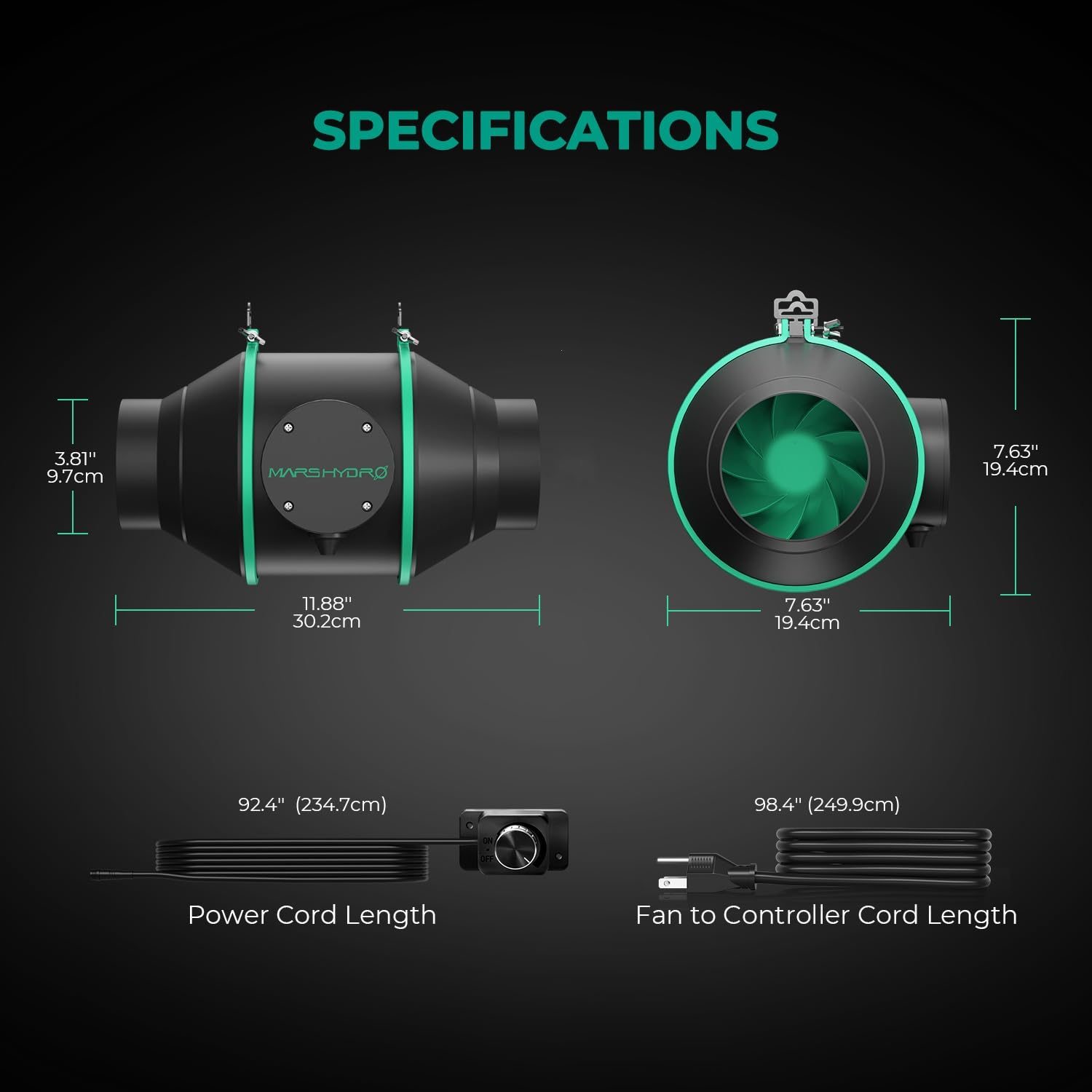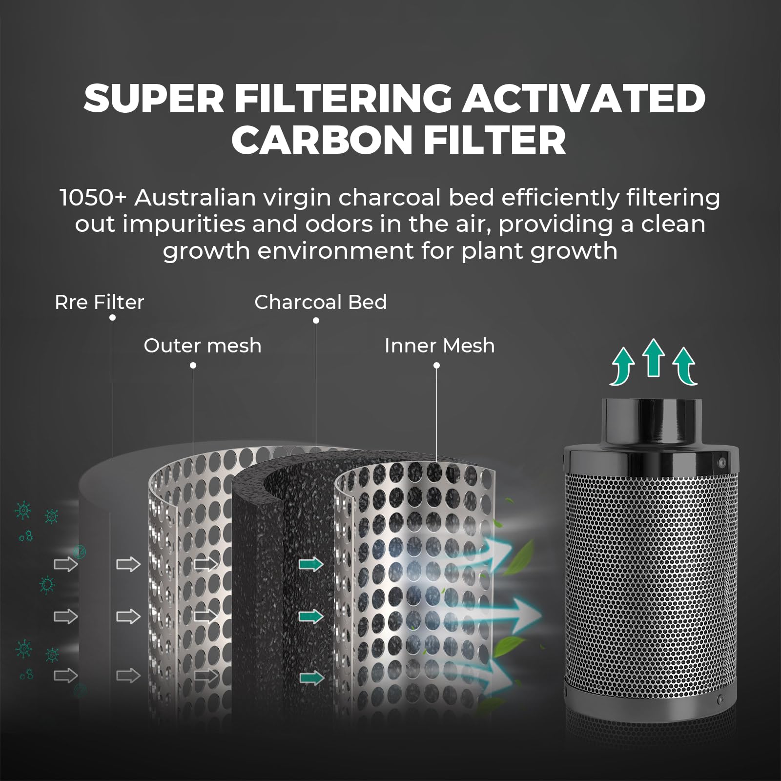 • 【ADJUSTABLE&EFFICIENT VENTILATION SYSTEM】Fan Speed 2550RPM , Airflow: 205 CFM , Noise: 26.8dB. Upgraded Inline Fan with EC motor & metal case &0 to100% speed controller, more durable & safer to use! 4' Fan Carbon Filter; 1050+RC 48 Australian virgin charcoal, equipped with 25 ft long flexible pipes, quickly and effectively transports air, effectively filters impurities and odors in the air.