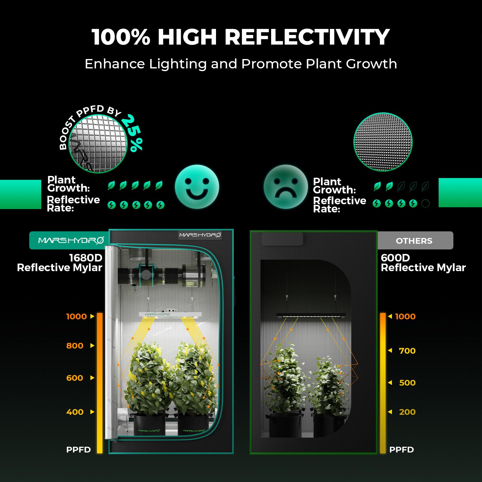 • 【100% HIGH REFLECTIVE&HIGH QUALITY GROW TENT】Grow tent interior is high reflective and density 1680D diamond mylar,boost 25% PPFD than 600D.The zipper is smooth and durable,with a unique light-blocking fabric sewn between it and the canvas to prevent any light leakage.The 1680D canvas is double-stitched for tear resistance,perfectly keep 100% light inside.Metal frame(thickness is 0.8mm),ensure security and stability, supports up to 88lb/40kg.