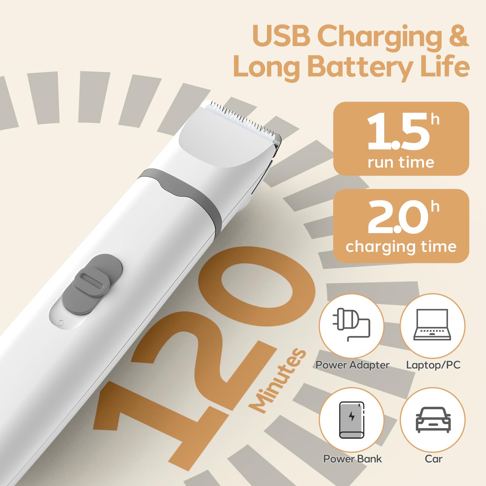 • Ergonomic Design Hair Clippers Kit for Dogs: Our Cordless dog trimmer is light weight, Rechargeable electric hair clippers for dogs with built-in battery make it flexible for you, Which allows you to trim your pet anytime, anywhere. You don't have to worry about tangled wires. This hair clippers for dogs can be used for 1.5 hours after being re-charged for 2 hours. USB charging cable is provided, not the power adapter.