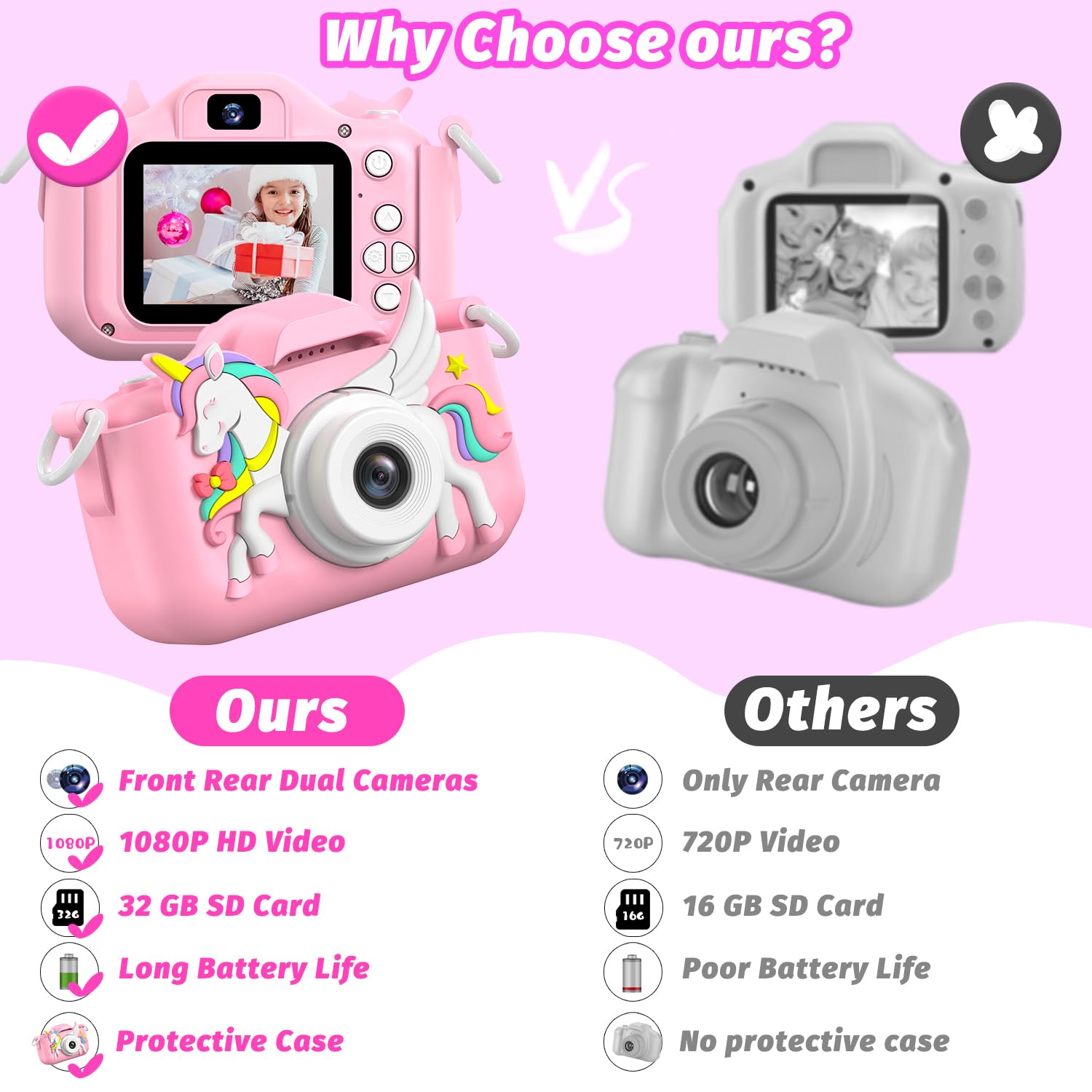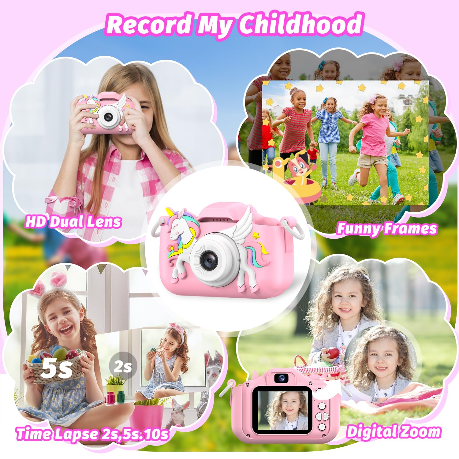 • High Definition & Selfie Camera: Our children cameras can take clear photos and 1080P videos, greatly improve the quality of photos and videos, help kids record the beautiful scenes and wonderful moments of life. Front-rear dual-lens, kids can selfies easily. With the function of Digital zoom, Timelapse, Loop recording, etc, more interesting for kids to learn photography, 2 inch Large LCD screen design, protects kid's eyes, is comfortable to read, perfect mini video camera toys for kids