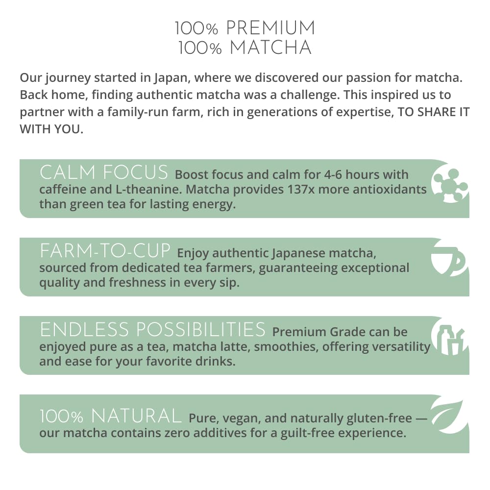• Farm-to-cup: Matcha tea often passes through many hands before reaching consumers. Our matcha comes directly from dedicated tea farmers in Japan who are passionate about their work.