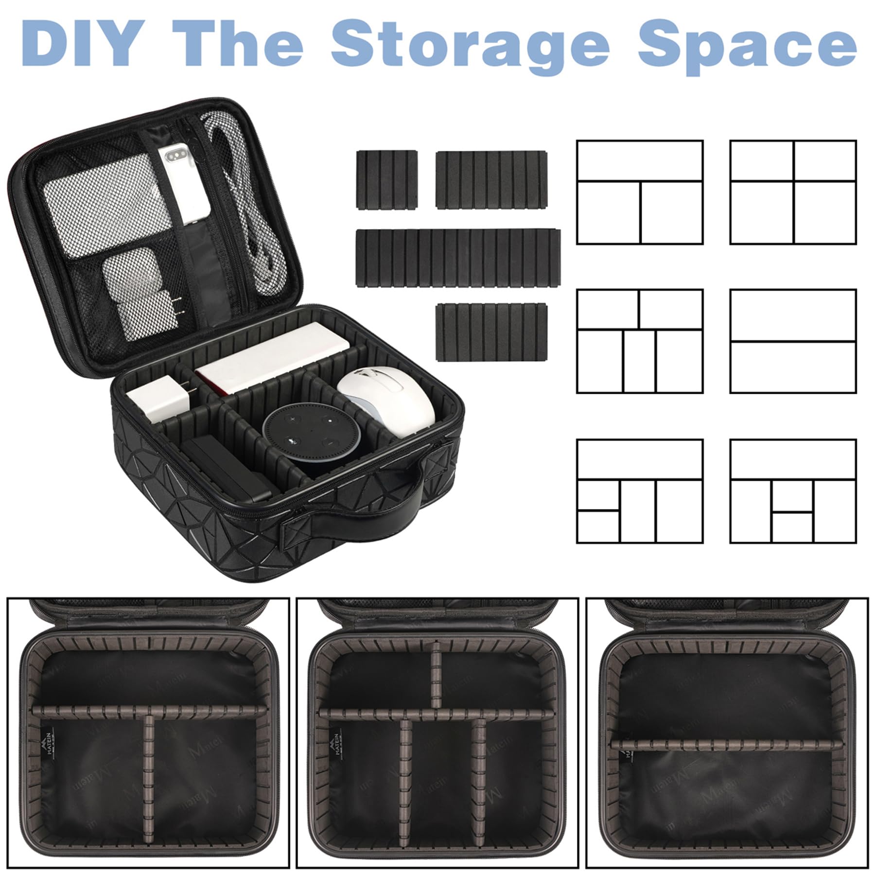 • Diy & Large Capacity: This Cable Organizer has an amazing storage space. Four removable strong shock-absorbing partition protect all items inside from scratches, impact and accidental falling. According to your needs, you can easily carry out various items. A variety of design layouts bring unlimited possibilities to your storage space
