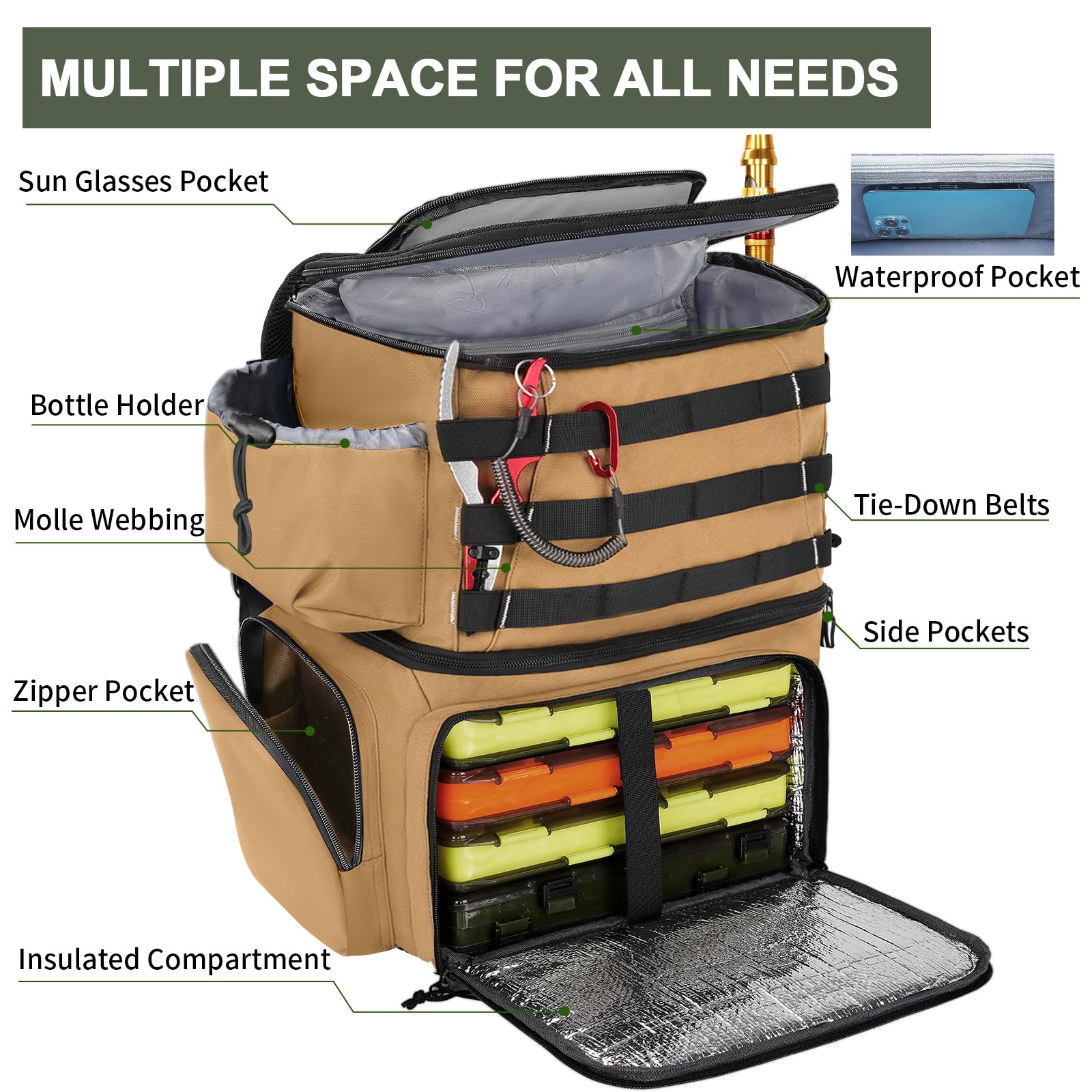 • Dual Structure with Cooler: MATEIN fishing backpack has a large front cooler compartment could hold four 3600 tackle boxes(TACKLE BOXES NOT INCLUDED). The dual zipper rope 180 degree open tackle box compartment is convenient for storing fishing gear and quick access, providing ample space for all fishing gear and accessories. Benefit from insulation aluminum fabric, fishermen can use it as a cooler to keep food, drinks, fruits, and lunch warm/cold/fresh to replenish energy