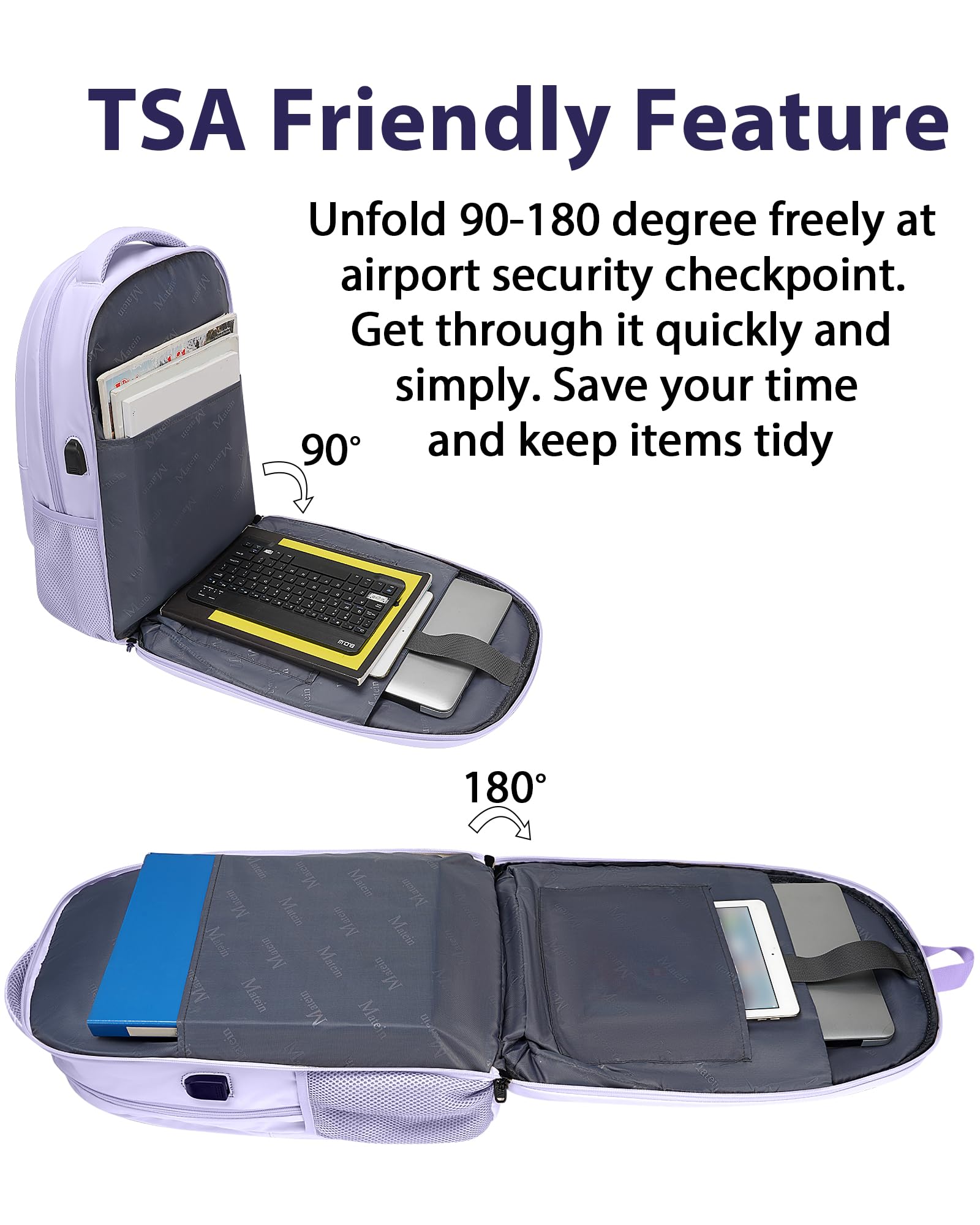 TSA Approved Backpack: 17 inch laptop compartments' tsa function is designed for airplane flight travel. Large capacity laptop travel backpack can unfold 90 to 180 degree, making the large laptop bookbag get through airport security checkpoint more easily and quickly. This 17 in large laptop backpack is roomy and smart enough for college school, daily office work, weekend getaway, overnight trip, travel