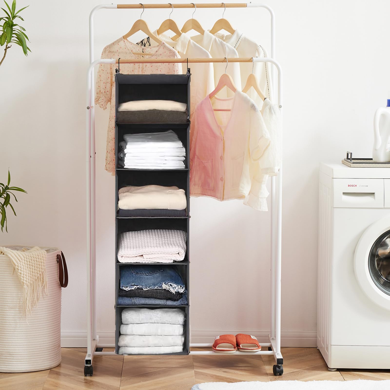 MAX Houser 6 Tier Shelf Hanging Closet Organizer, Closet Hanging Shelf with 2 Sturdy Hooks for Storage, Foldable (Grey)