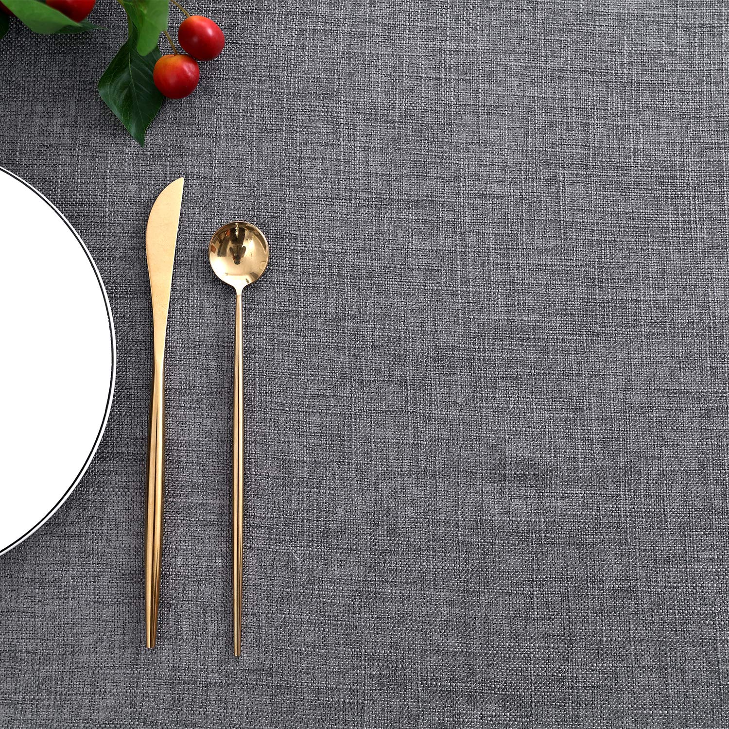 • Our table cloths are made of high-quality polyester faux linen yarn, with 2-tone slubby texture. It is more durable than real linen yet soft and supple; while protecting table surface, our tablecloth also adds a sense of understated luxury to your dining scene.