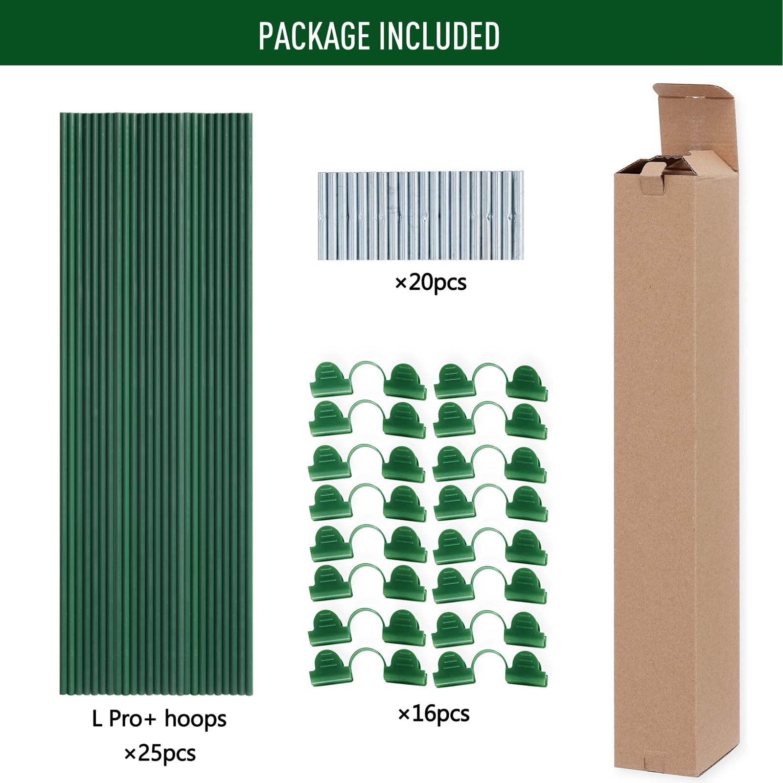 • 【DIY KIT】Includes 25 large-diameter hoops, each 17" long, 20 connectors, and 16 clips. You can combine 5 or more hoops to create your own grow tunnel. The clips can also be used to secure the greenhouse covering.