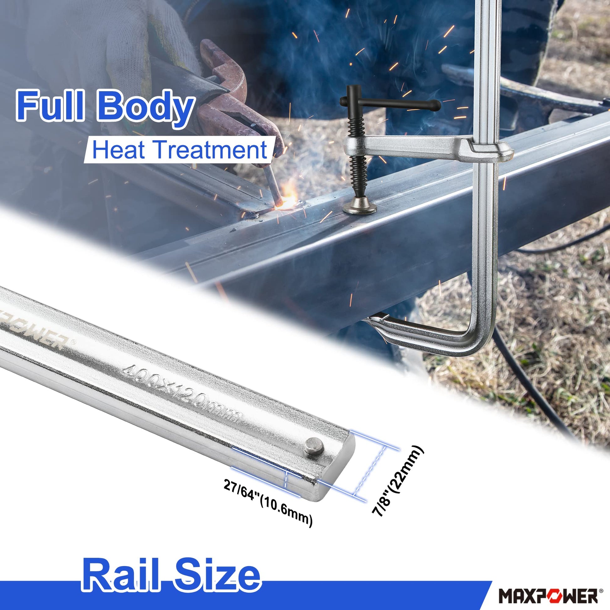 • Heavy duty f style welding clamp, Max jaw capacity up to 16 inch, throat depth 4-3/4 inch ( 120mm ), Rail size 7/8" x 27/64" ( 22 x 10.6 mm )